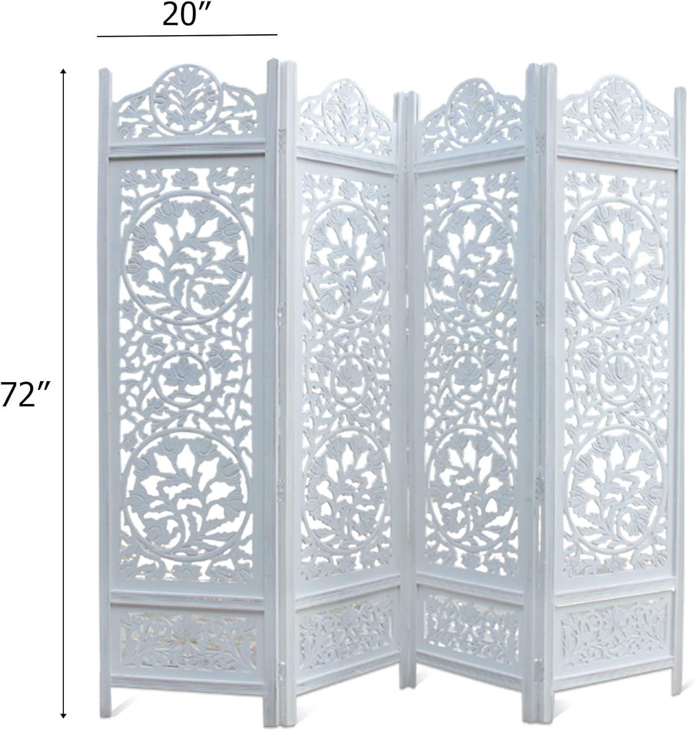 COTTON CRAFT Room Divider Wood Floor Screen – Kamal Antique White 4 Folding Panel 72×80 – Portable Reversible Functional Decorative Partition – Reversible Boho Freestanding Small Spaces Privacy(Kaveri – White)