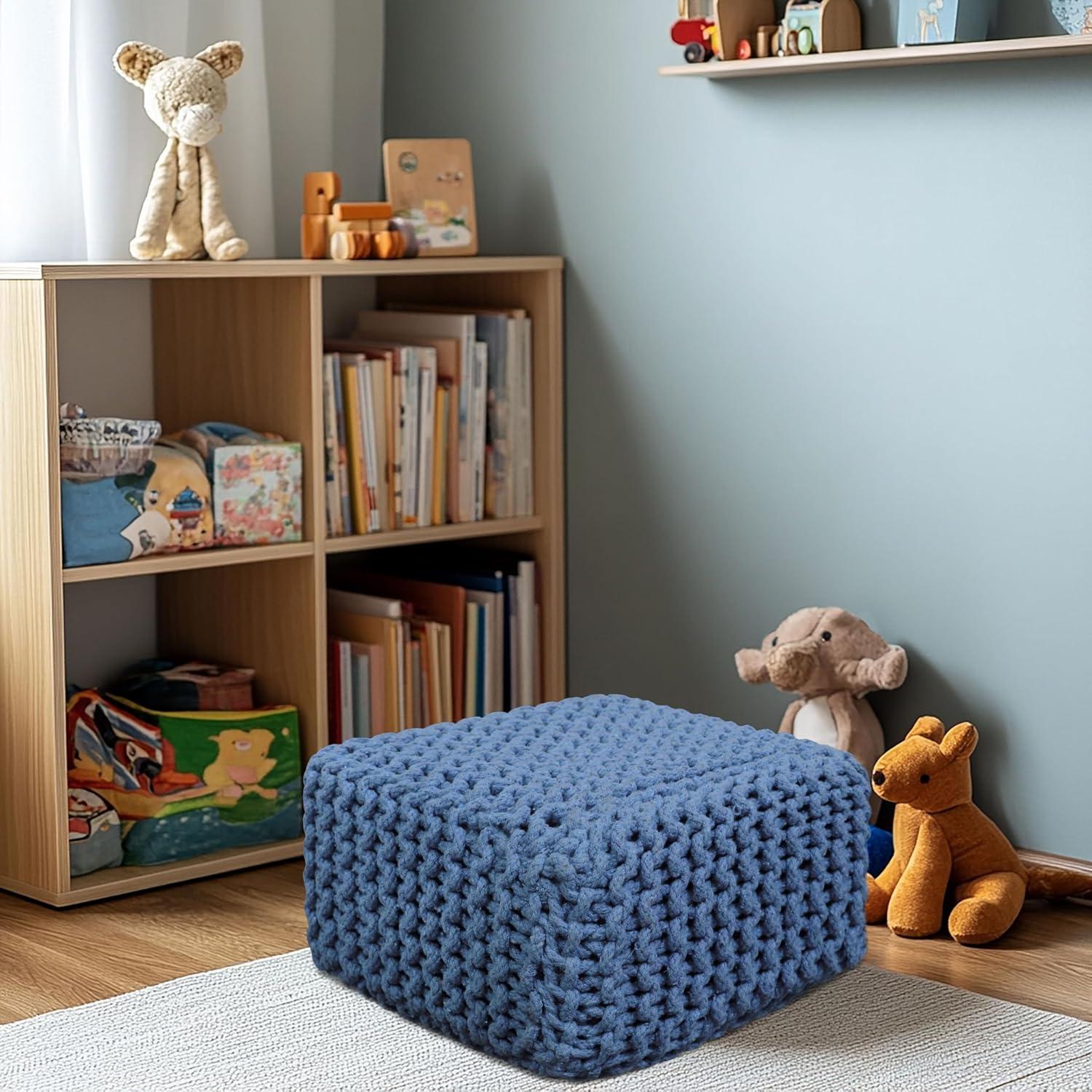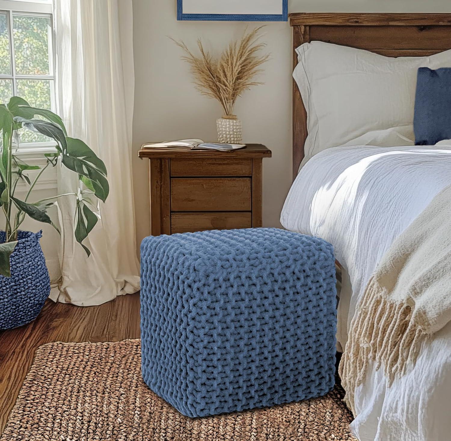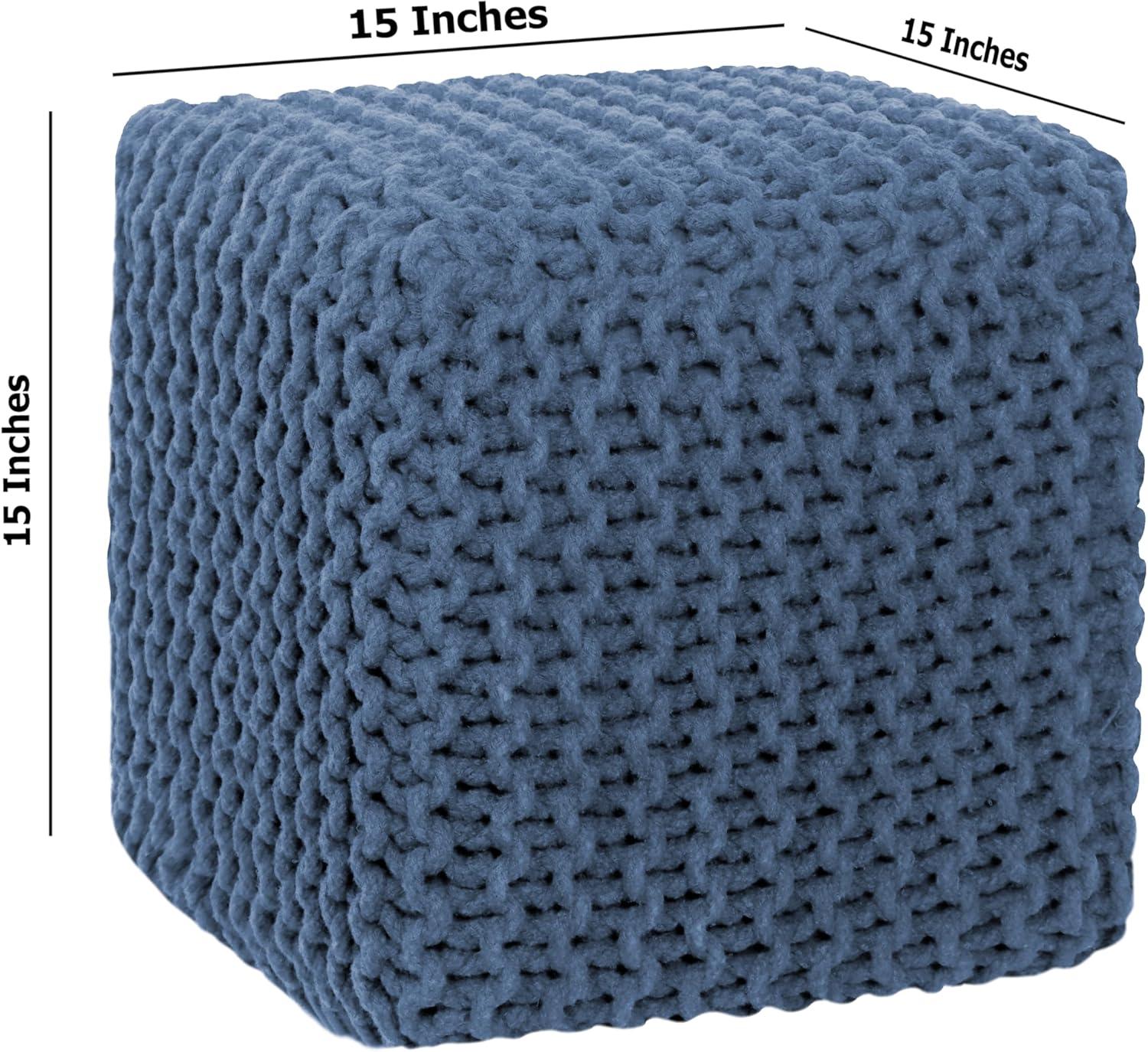 COTTON CRAFT Round Dori Pouf – Cotton Braid Cord Cable Knitted Ottoman – Foot Stool Footrest Floor Pouf Accent Furniture Bean Bag – Living Room Dorm Décor – 20.5 Dia x 13.5 High – Round Ivory Cream(Blue – Cube Small)