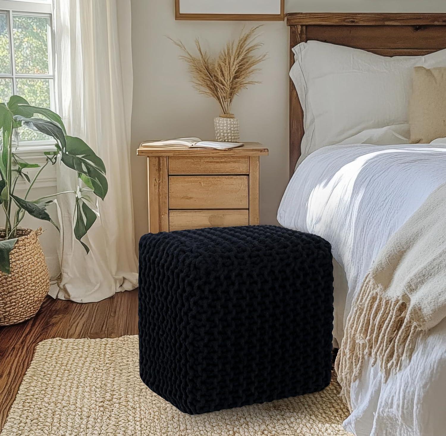 COTTON CRAFT Hand Tufted Pouf – Bedroom Dorm Home Accent – Foot Stool – Ottoman – Bean Bag – Versatile Modern Comfortable Prefilled Woven Cotton Square Pouf Footrest – 16x16x16 inches – Ivory(Black Dhurrie)