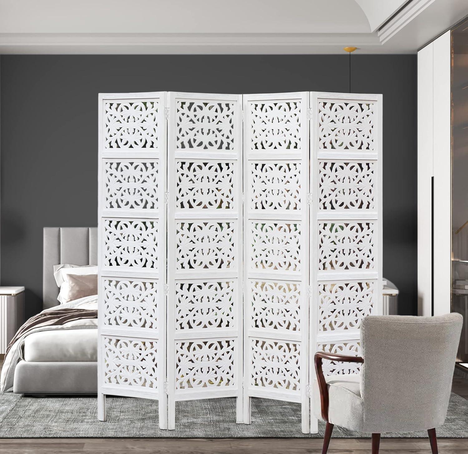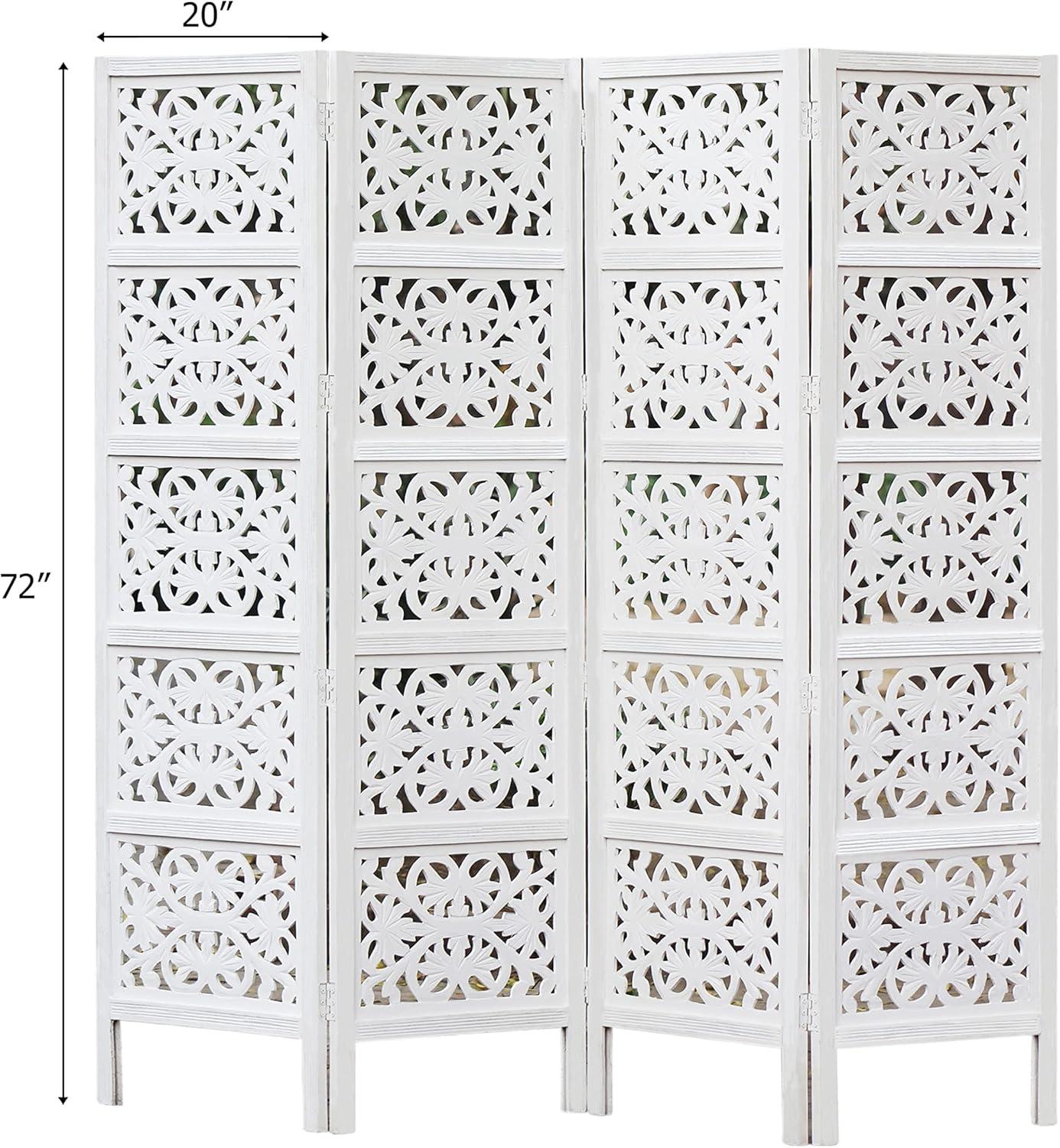 COTTON CRAFT Room Divider Wood Floor Screen – Kamal Antique White 4 Folding Panel 72×80 – Portable Reversible Functional Decorative Partition – Reversible Boho Freestanding Small Spaces Privacy(Kaveri – White)