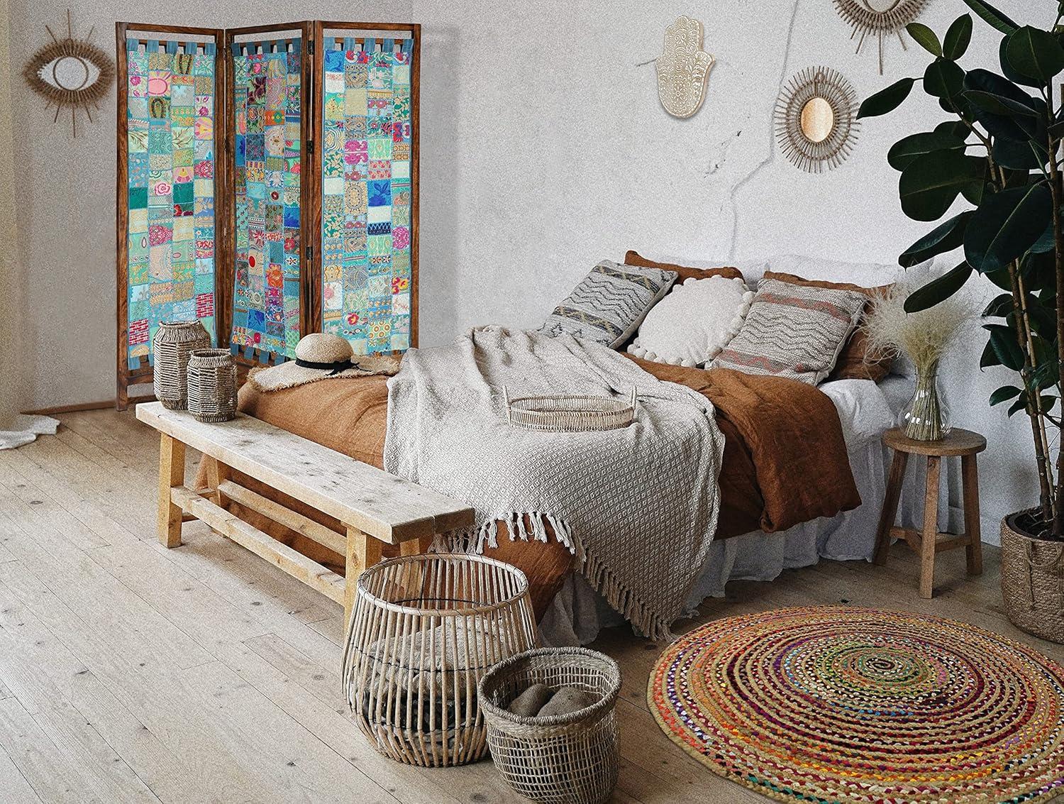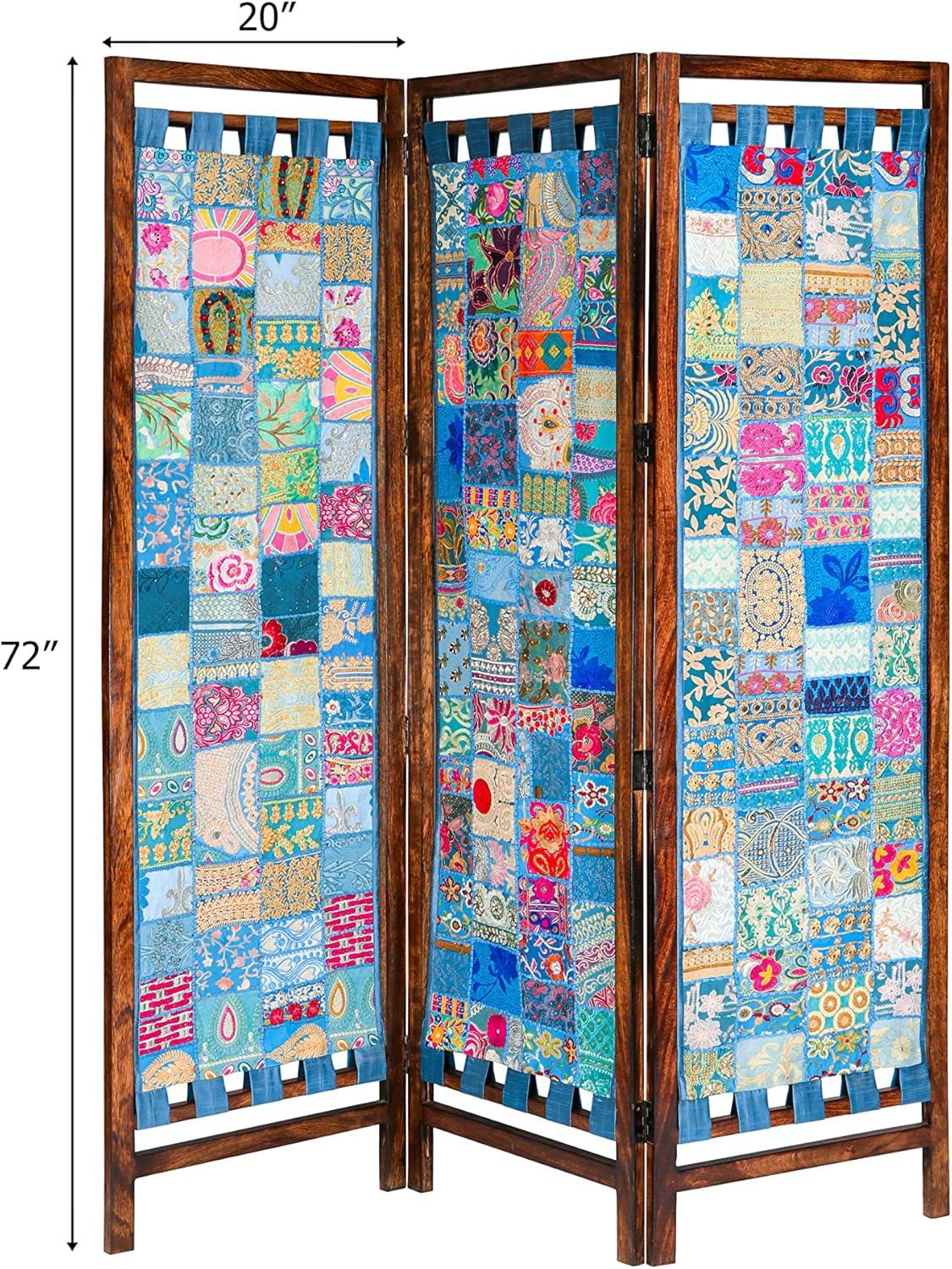 COTTON CRAFT Room Divider Wood Floor Screen – Kamal Antique White 4 Folding Panel 72×80 – Portable Reversible Functional Decorative Partition – Reversible Boho Freestanding Small Spaces Privacy(Sari – Teal Multi)