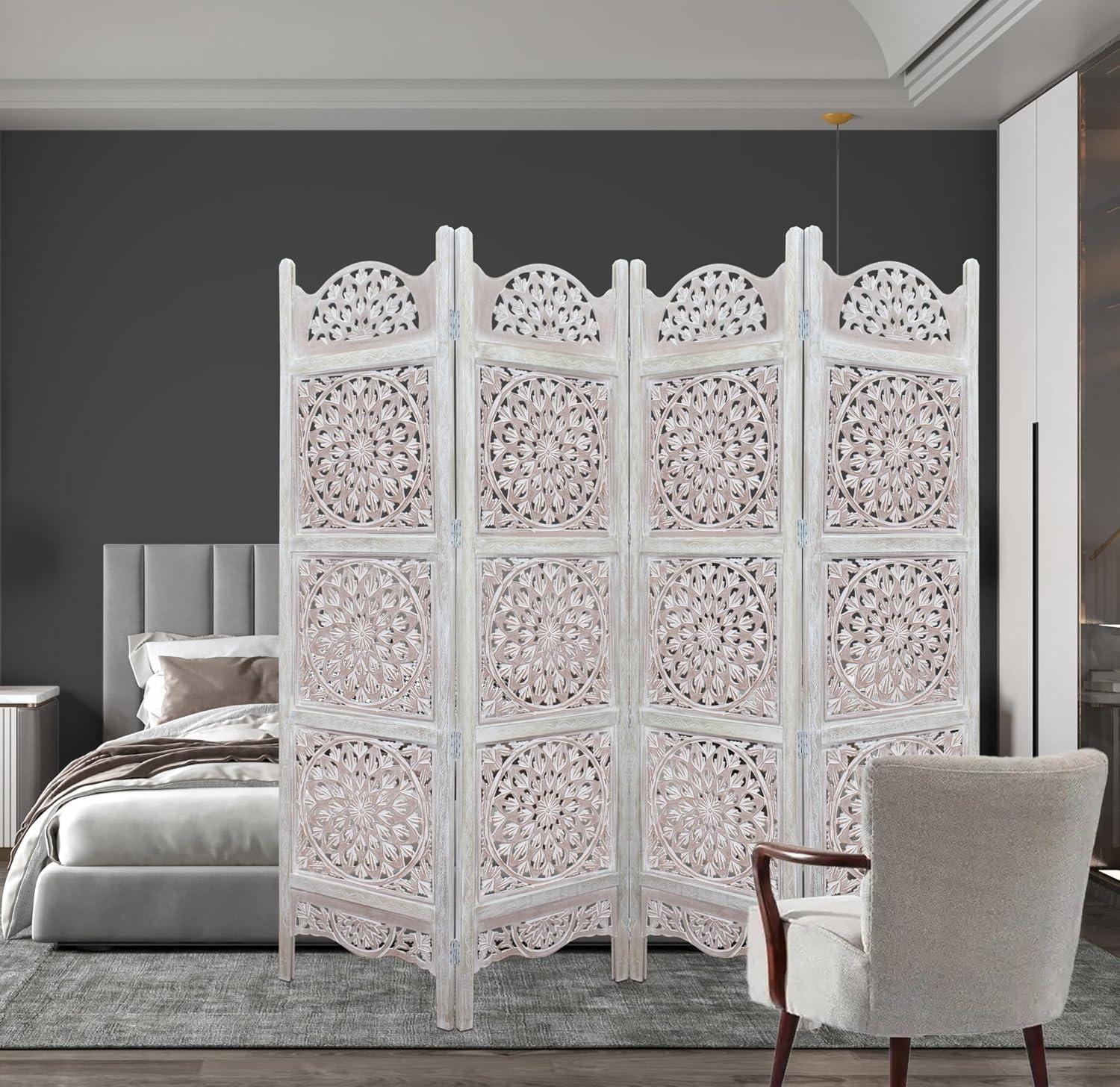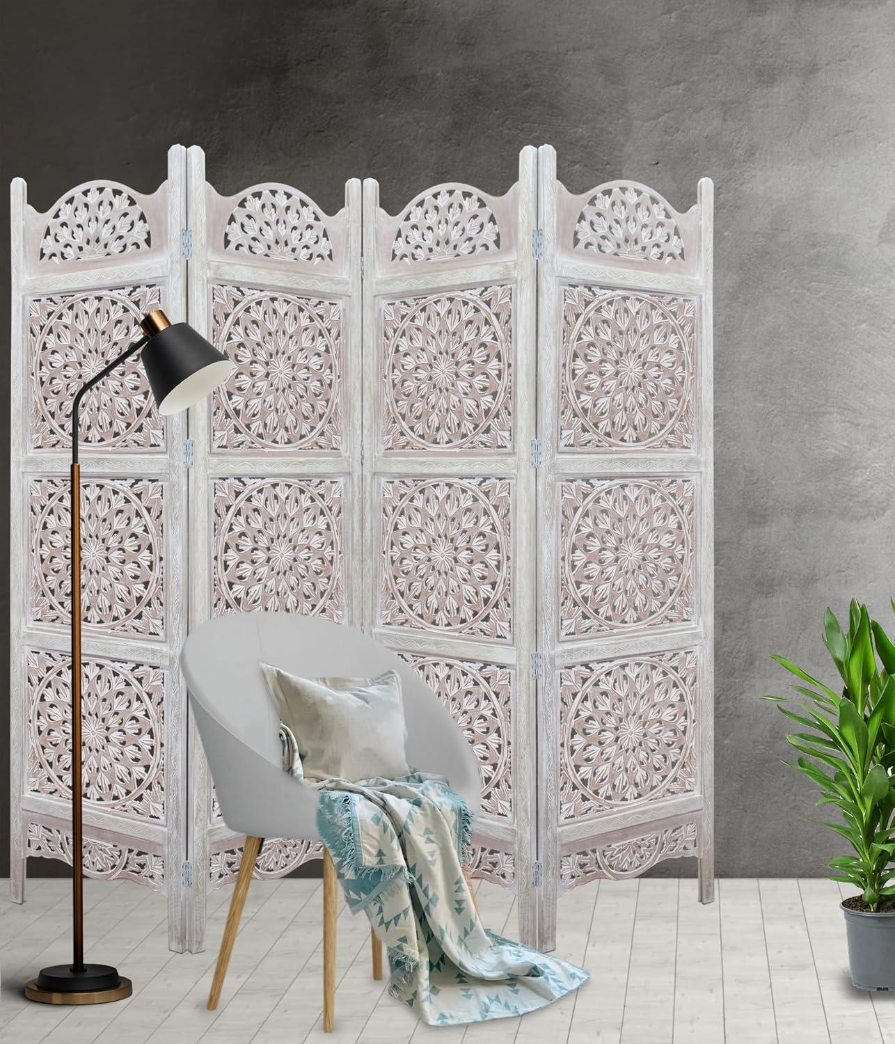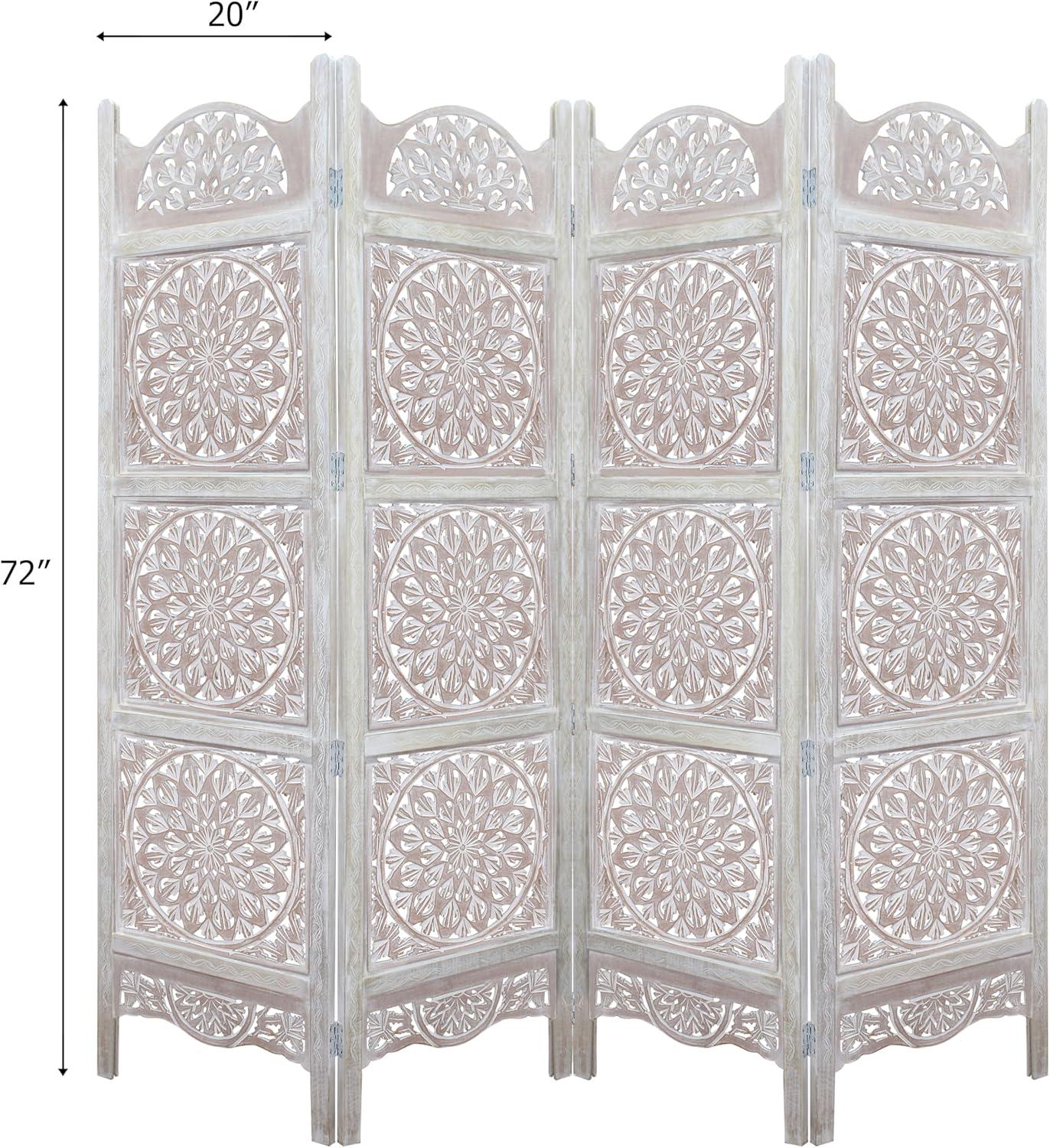 COTTON CRAFT Room Divider Wood Floor Screen – Kamal Antique White 4 Folding Panel 72×80 – Portable Reversible Functional Decorative Partition – Reversible Boho Freestanding Small Spaces Privacy(Medallion – White Wash)