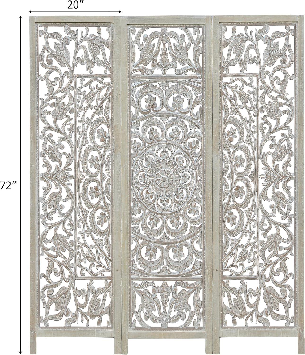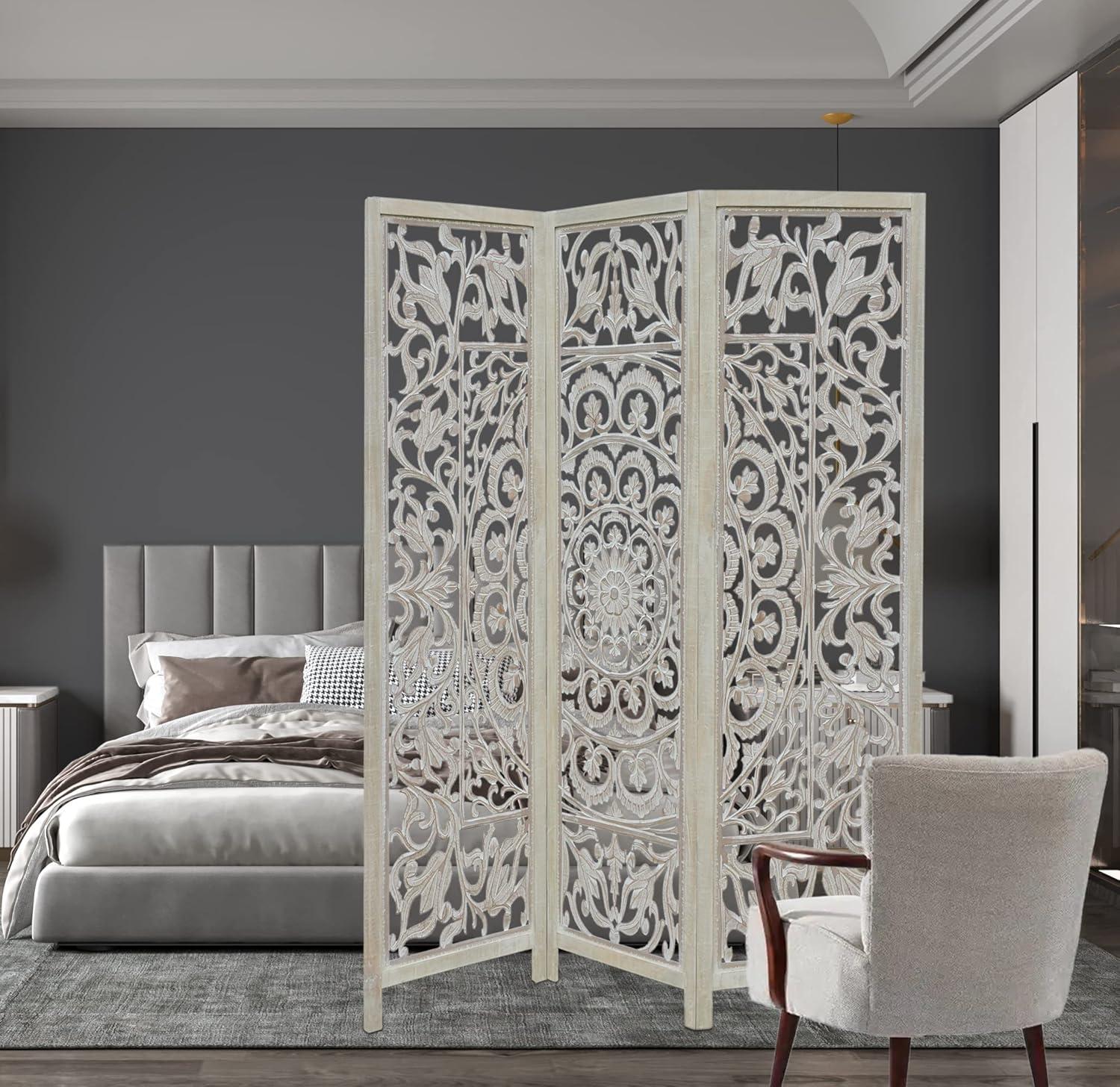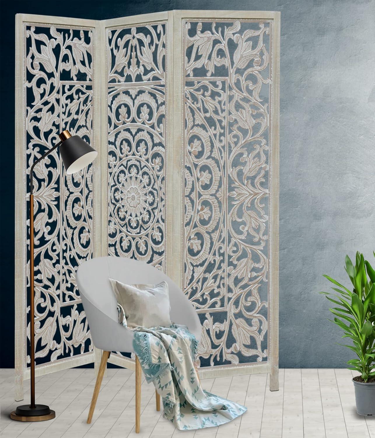 COTTON CRAFT Room Divider Wood Floor Screen – Kamal Antique White 4 Folding Panel 72×80 – Portable Reversible Functional Decorative Partition – Reversible Boho Freestanding Small Spaces Privacy(Medallion – White Wash)