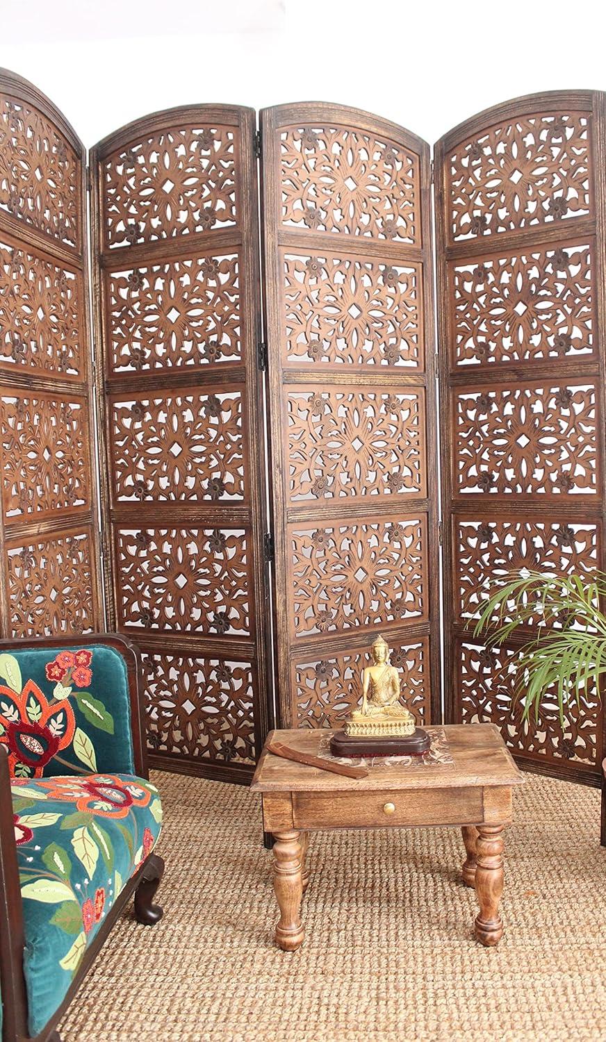 COTTON CRAFT Room Divider Wood Floor Screen – Kamal Antique White 4 Folding Panel 72×80 – Portable Reversible Functional Decorative Partition – Reversible Boho Freestanding Small Spaces Privacy(Rajasthan – Antique Brown)