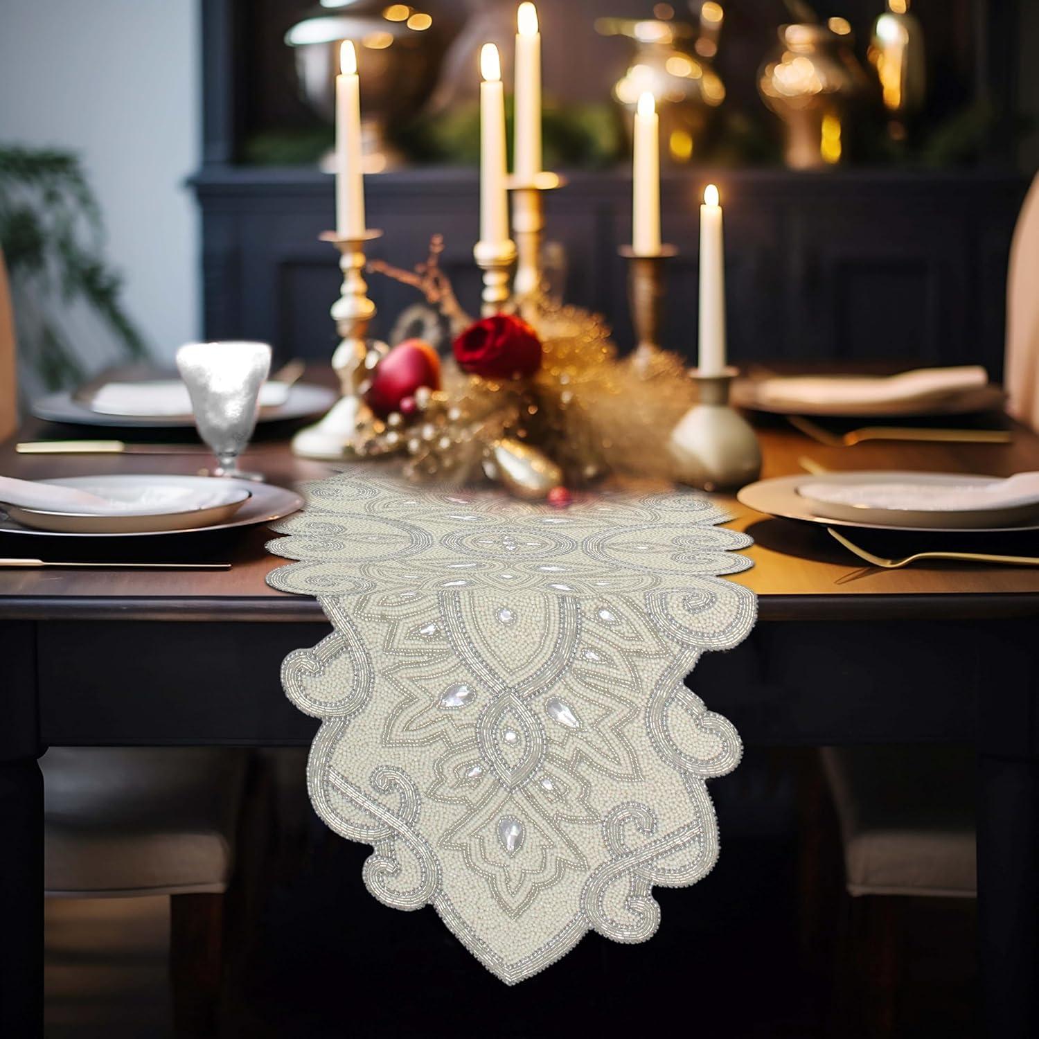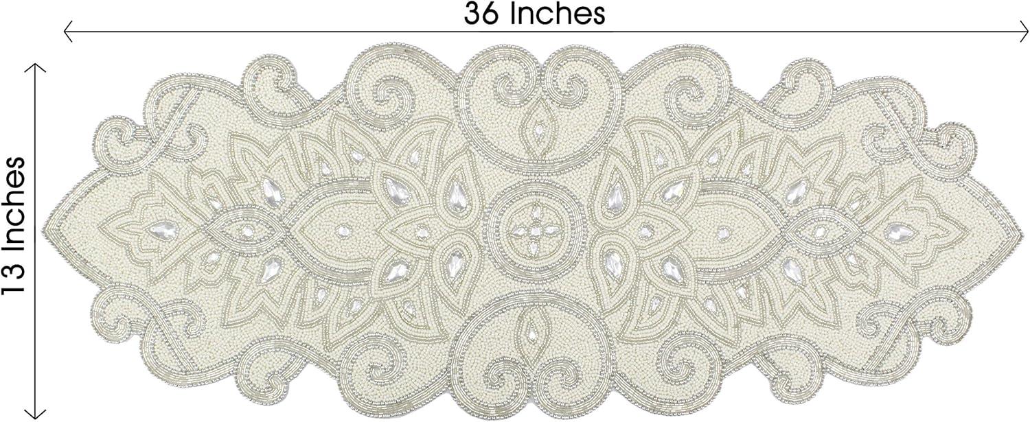 COTTON CRAFT Mila Scroll Handmade Beaded Table Runner – Halloween Harvest Autumn Fall Thanksgiving Holiday Christmas Xmas Celebration Festive Party Tabletop Décor Tablerunner – 13×36 Ivory & Silver(Gold)