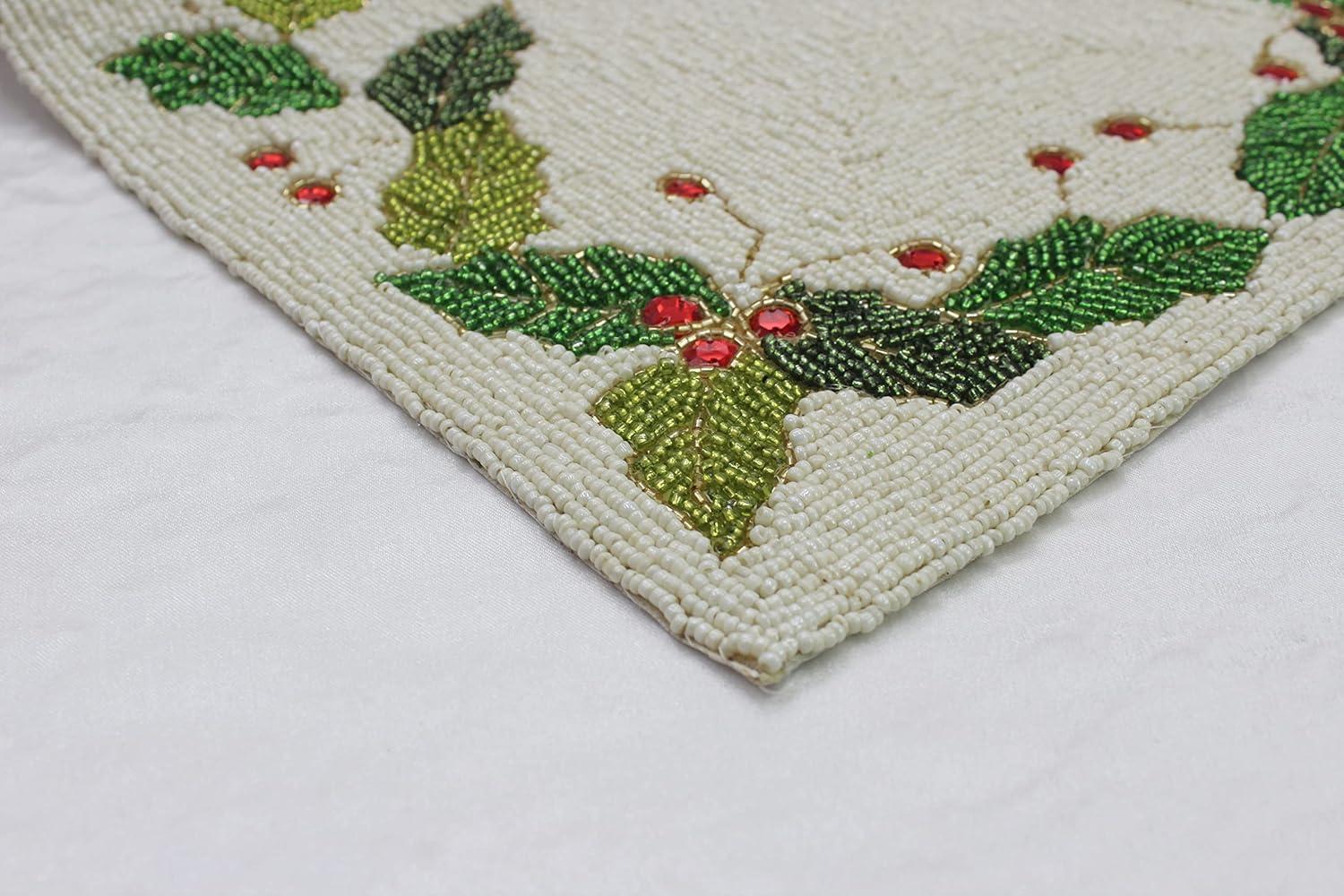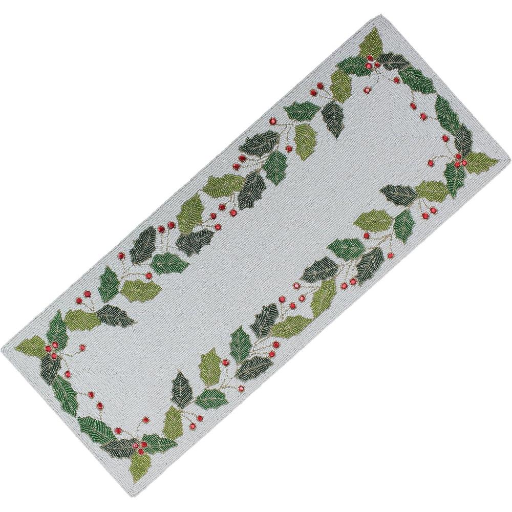 INCLUDES: One (1) COTTON CRAFT Christmas Holly Leaves Garland Beaded Table Runner measuring 13 inch x 36 inch in Red and Green.