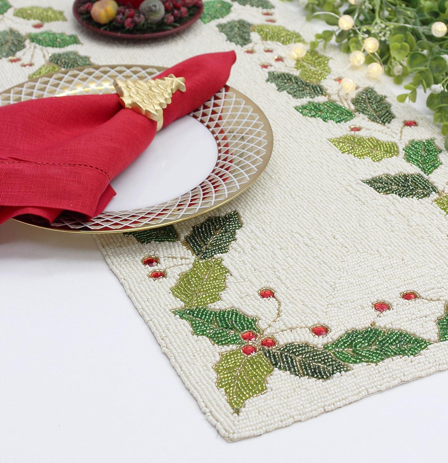 ARTISAN CRAFTED: Handmade and beaded by skilled artisans, these festive table runners lend an extra layer of dimension to your tablescape, and because they’re red, white with holly leaves they make a lovely addition to holiday table as well.