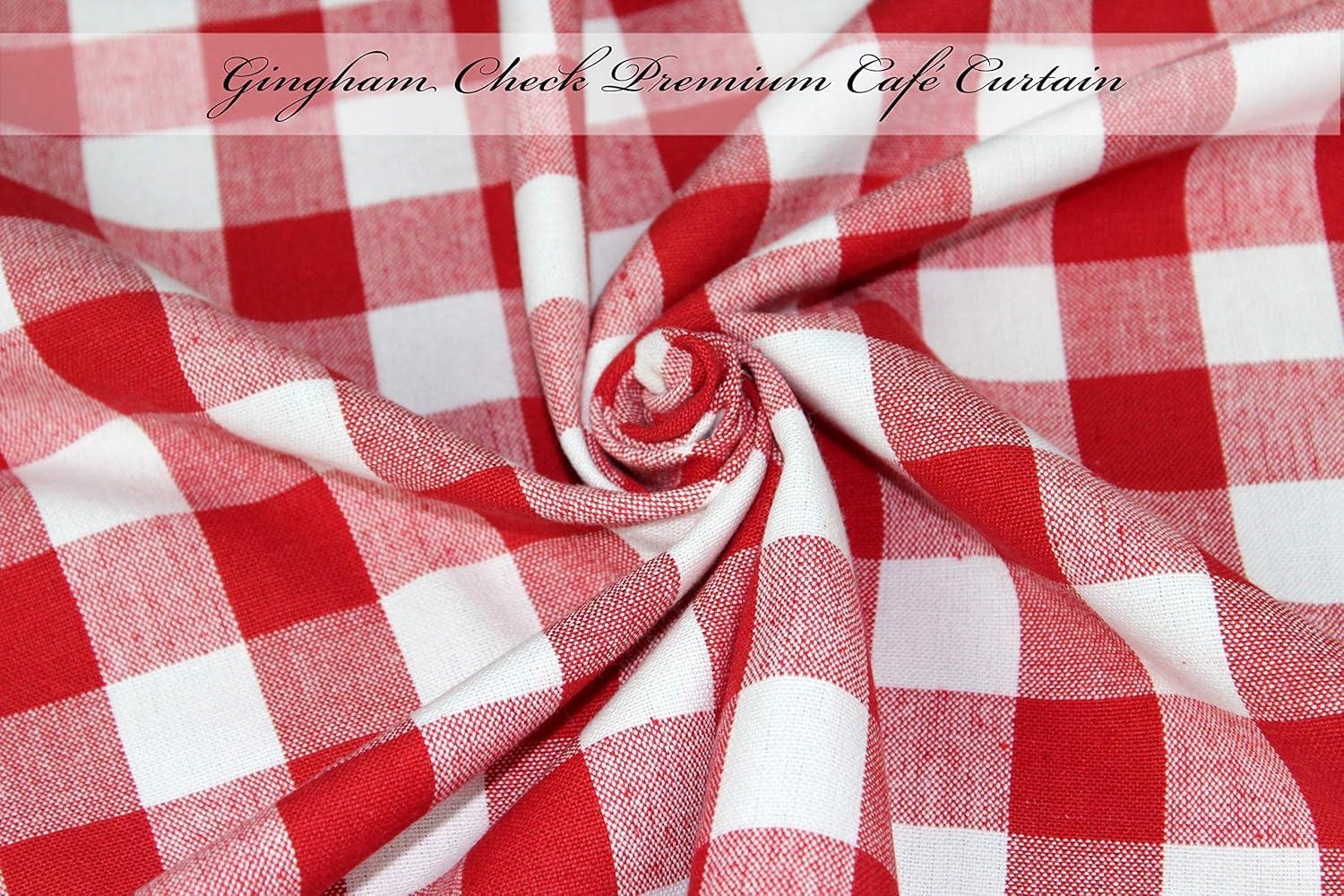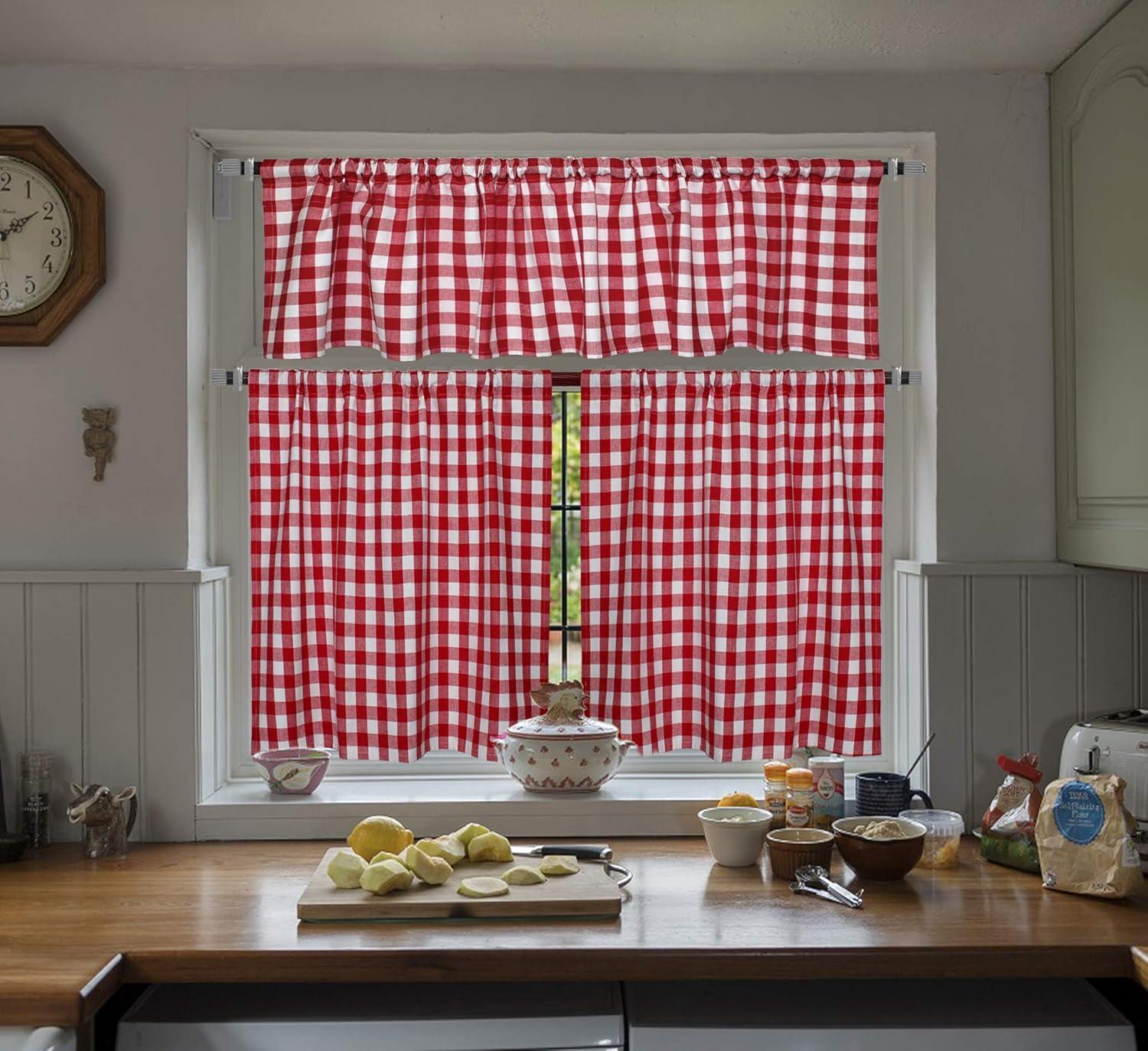 CONTENTS: Package contains pre shrunk three piece plaid Window Treatment Set containing 2 Café Curtain and 1 Valance.