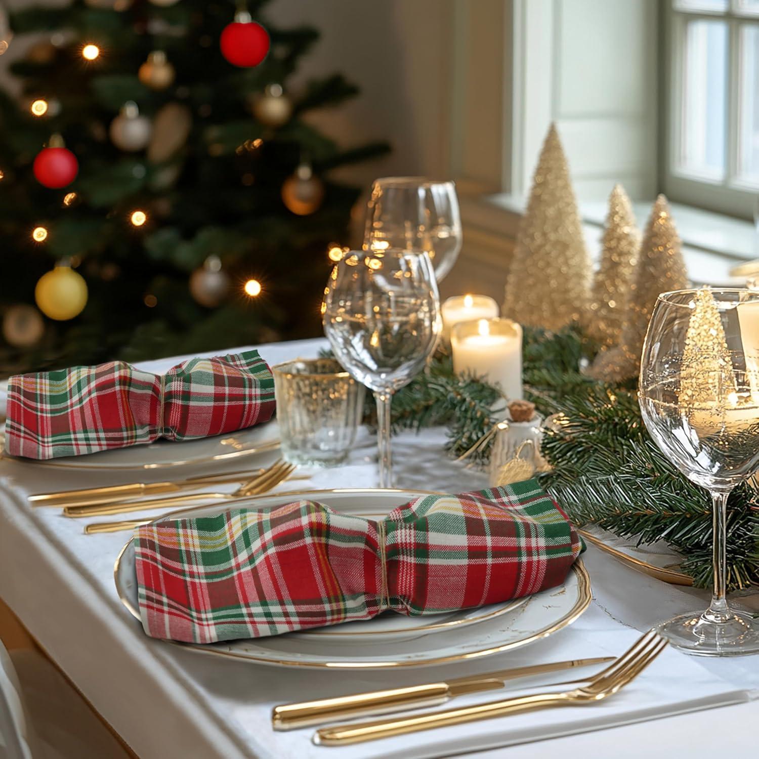 COTTON CRAFT Christmas Holiday Napkins -12 Pack – Cotton Cloth Table Napkins – Reusable Washable – Lunch Dinner Party Celebration Decorative Napkin Festive Gift Bag -17×17 White & Metallic Gold Stripe(Red Green Ivory Plaid)