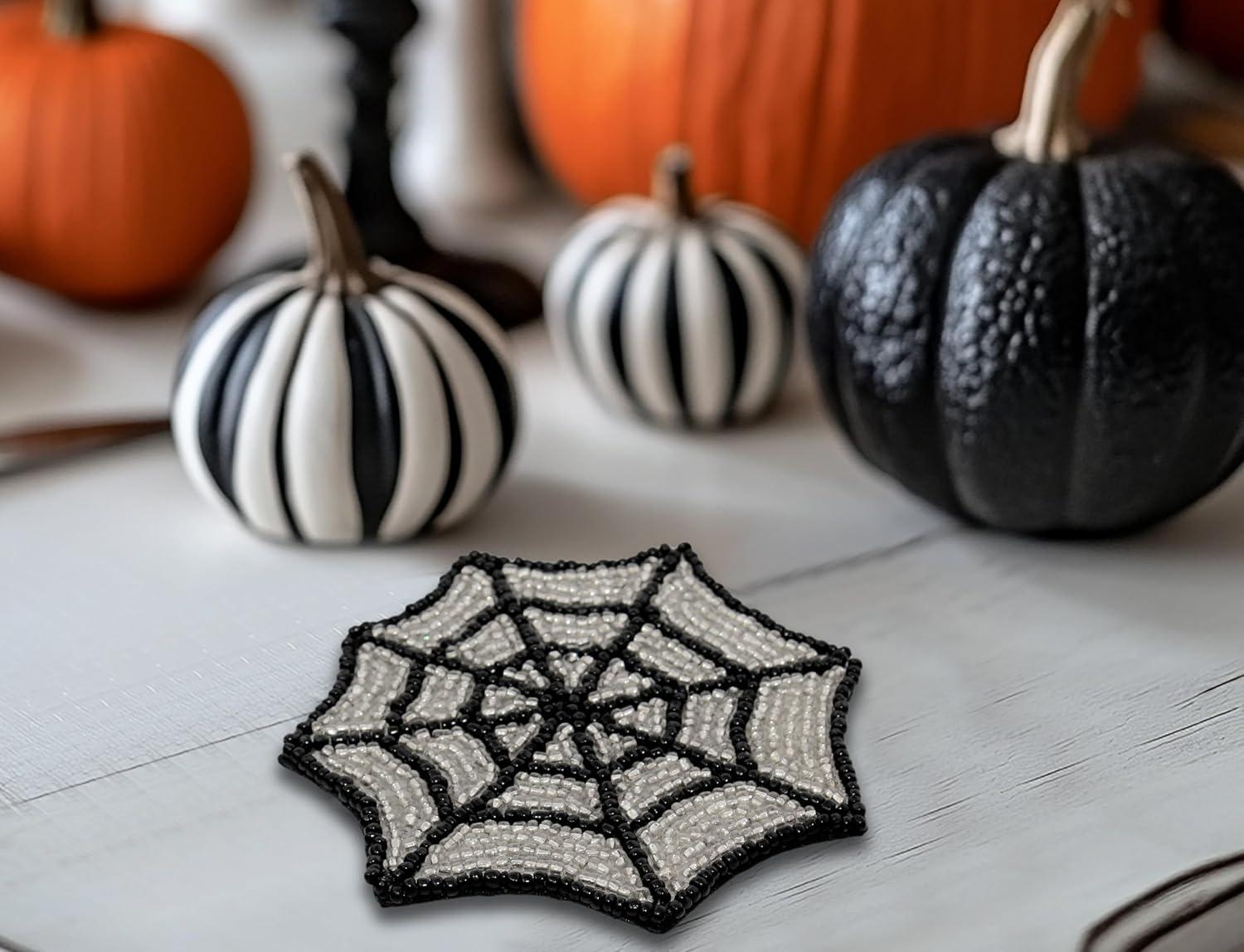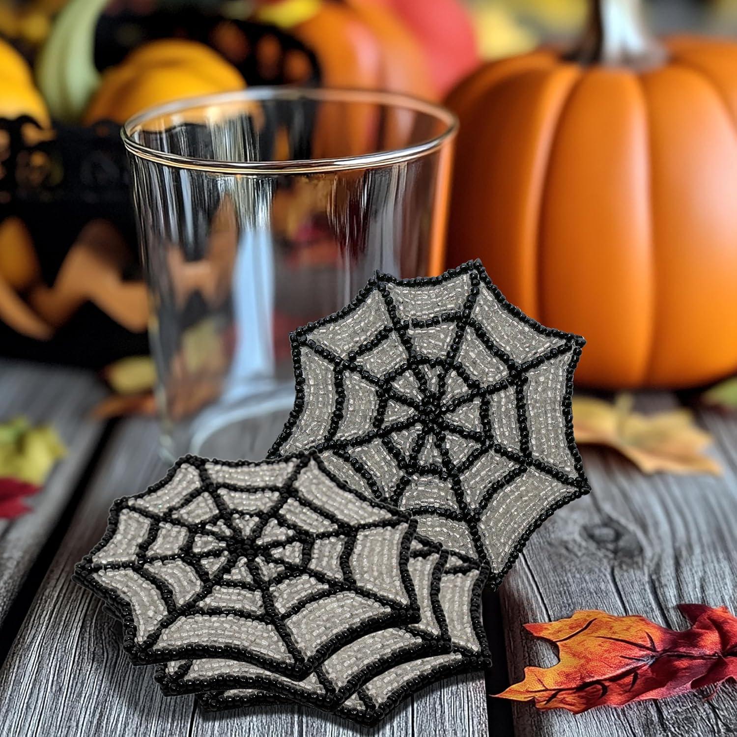 COTTON CRAFT Glitz Handmade Beaded Bar Drink Tabletop Protection Coasters – Set of 8 – Halloween Harvest Autumn Fall Thanksgiving Holiday Christmas Xmas Celebration Festive Party – 4 in Round – Silver(Black Silver Web)