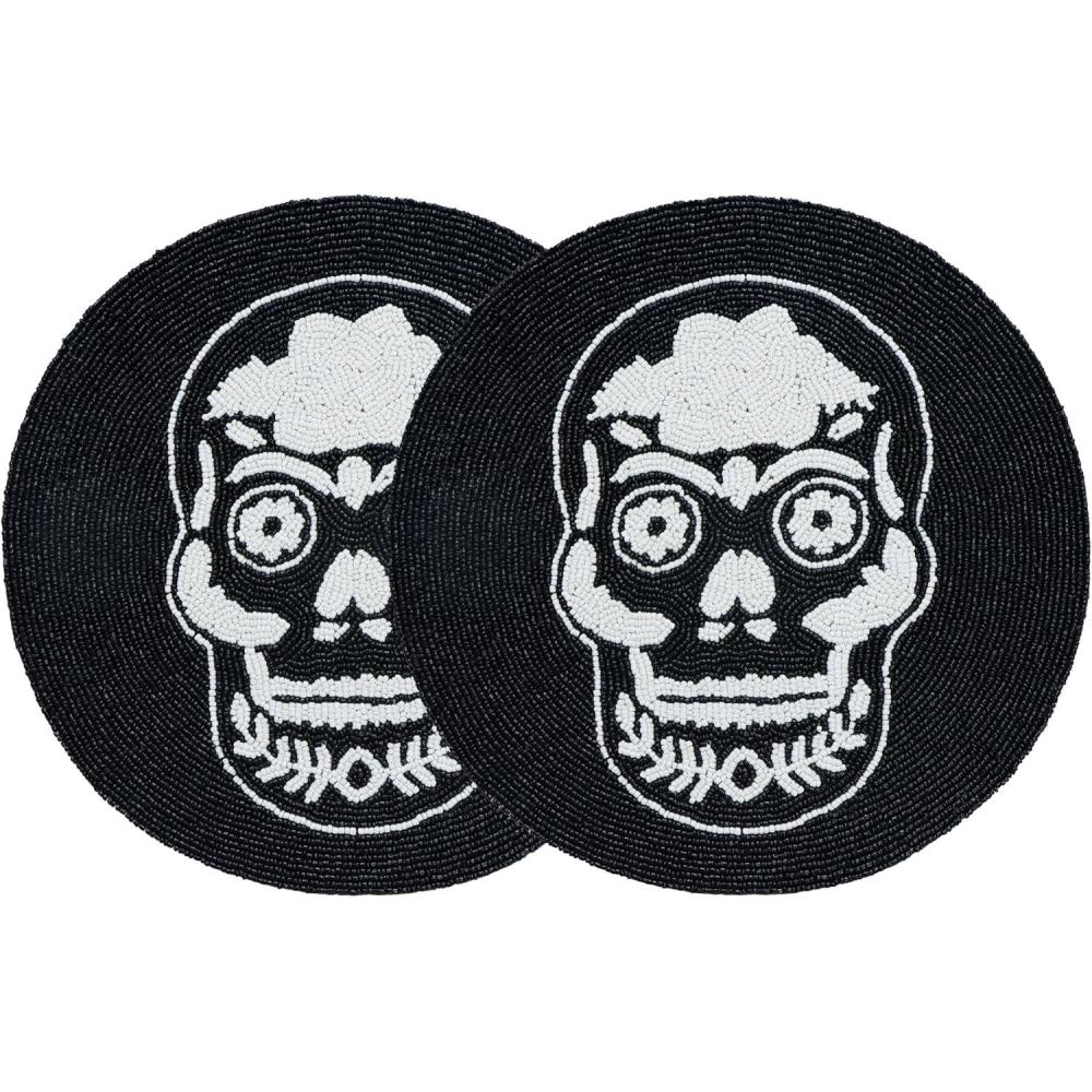 COTTON CRAFT Glitz Handmade Beaded Charger Placemats – Set of 4 – Halloween Harvest Autumn Fall Holiday Christmas Xmas Dining Celebration Festive Party Table Décor – 13.5 inch Round – Red(Black White – Skull)