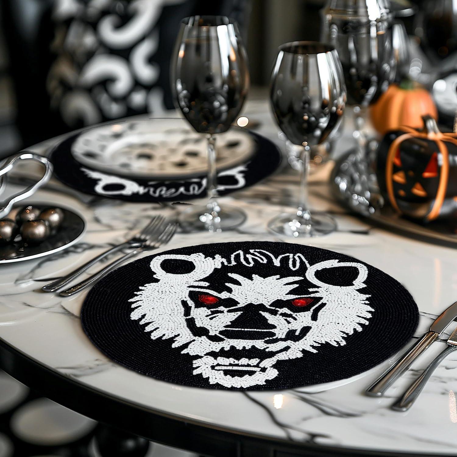 COTTON CRAFT Glitz Handmade Beaded Charger Placemats – Set of 4 – Halloween Harvest Autumn Fall Holiday Christmas Xmas Dining Celebration Festive Party Table Décor – 13.5 inch Round – Red(Black White – Werewolf)