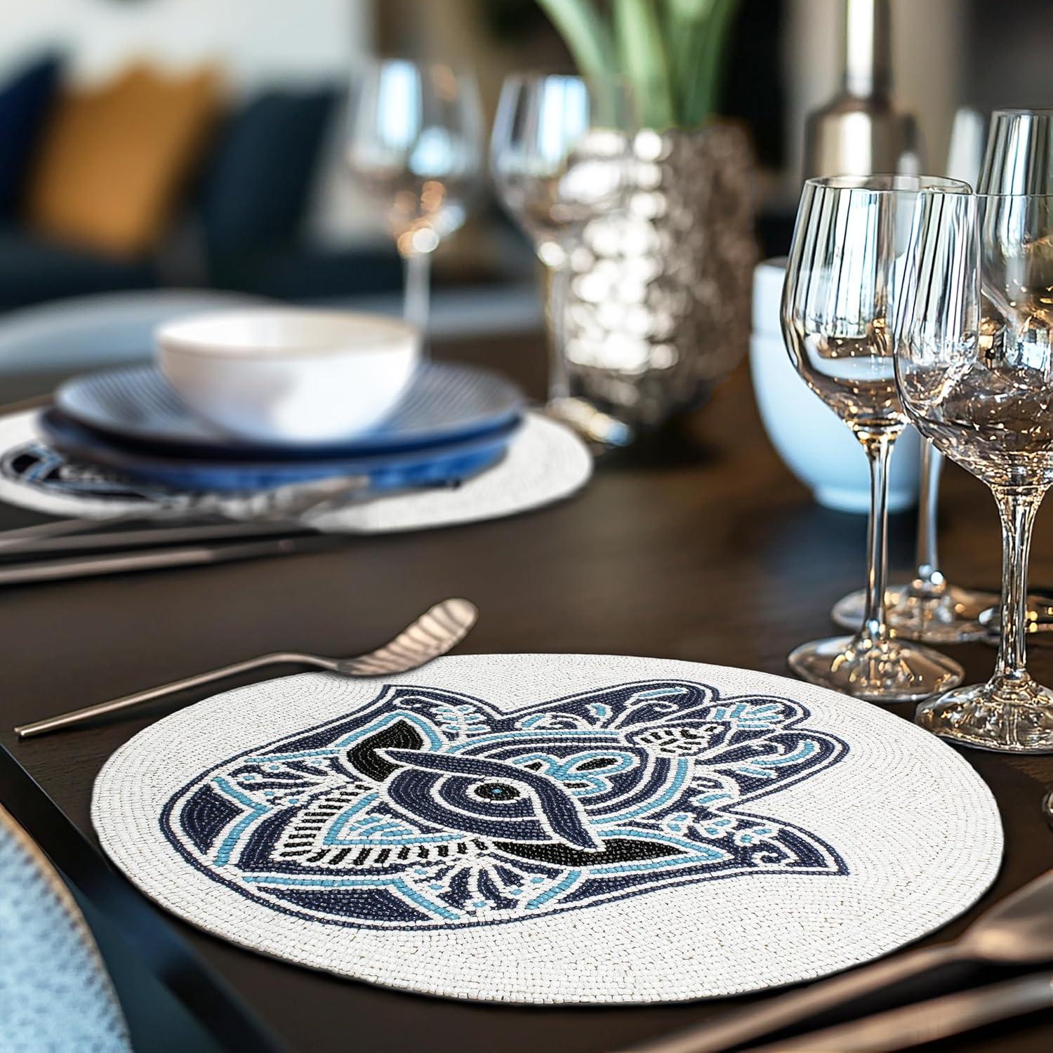 COTTON CRAFT Glitz Handmade Beaded Charger Placemats – Set of 4 – Halloween Harvest Autumn Fall Holiday Christmas Xmas Dining Celebration Festive Party Table Décor – 13.5 inch Round – Red(Blue – Evil Eye Hamsa)