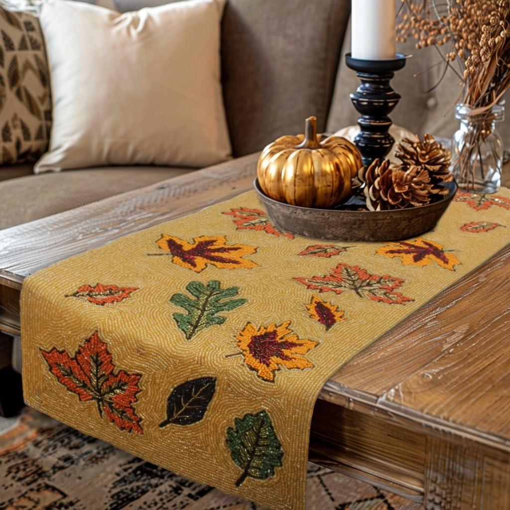 COTTON CRAFT Happy Hunting Handmade Beaded Table Runner – Easter Tulips Spring Floral Bunny Rabbit – Luncheon Dinner Celebration Festive Party Tabletop Décor Tablerunner – 13×36 – Easter Spring Multi(Scattered Leaves)