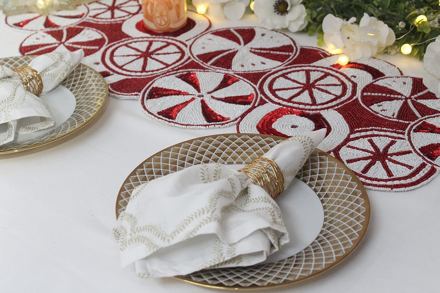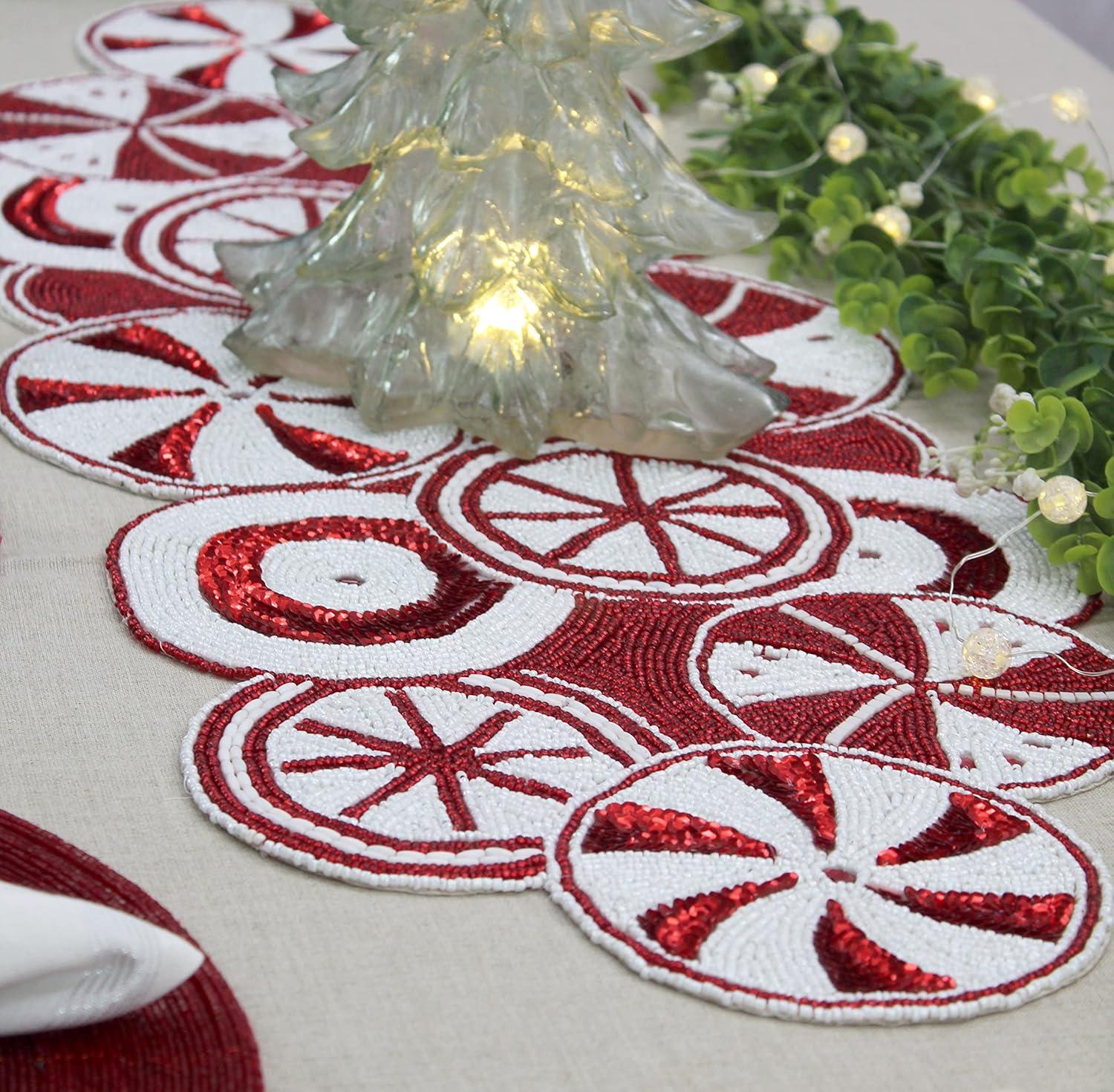 COTTON CRAFT Mila Scroll Handmade Beaded Table Runner – Halloween Harvest Autumn Fall Thanksgiving Holiday Christmas Xmas Celebration Festive Party Tabletop Décor Tablerunner – 13×36 Ivory & Silver(Candy Cane)