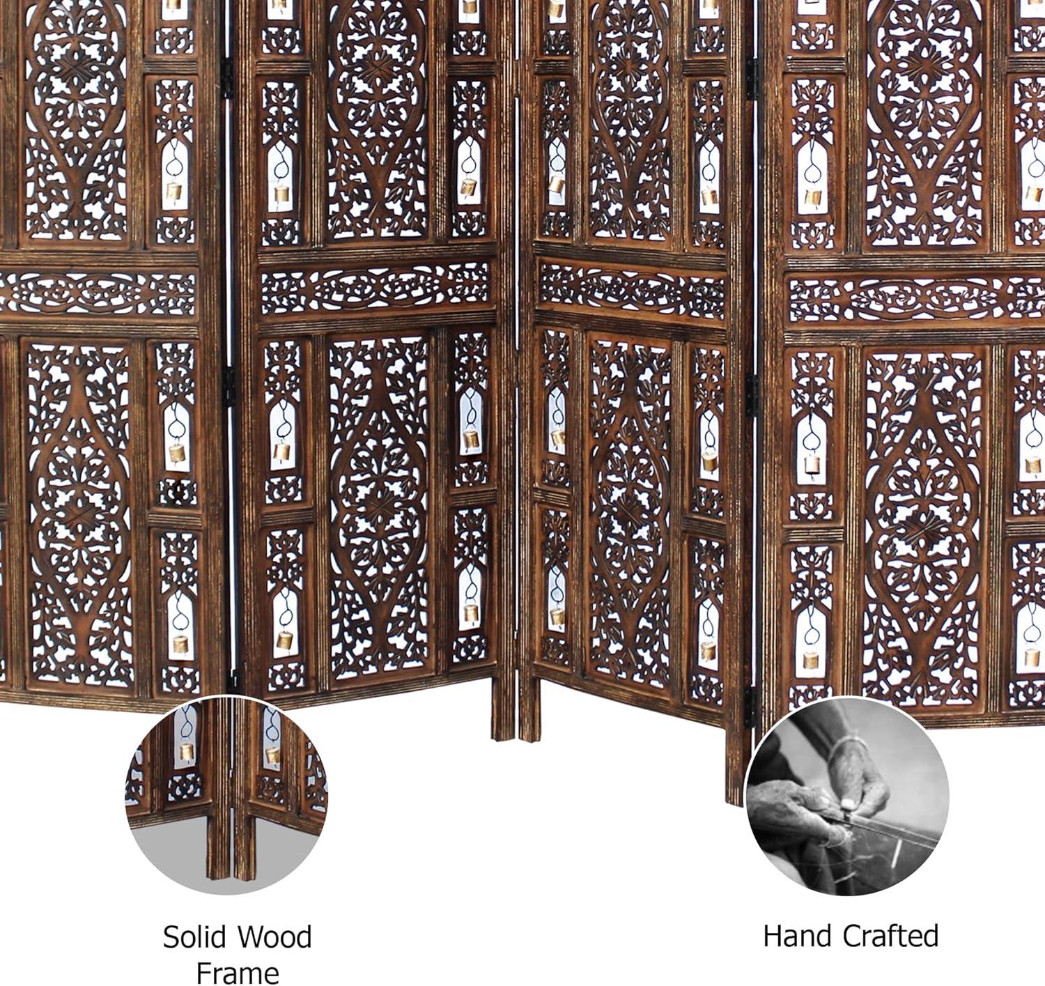 COTTON CRAFT Room Divider Wood Floor Screen – Kamal Antique White 4 Folding Panel 72×80 – Portable Reversible Functional Decorative Partition – Reversible Boho Freestanding Small Spaces Privacy(Ghanti – Antique Brown)