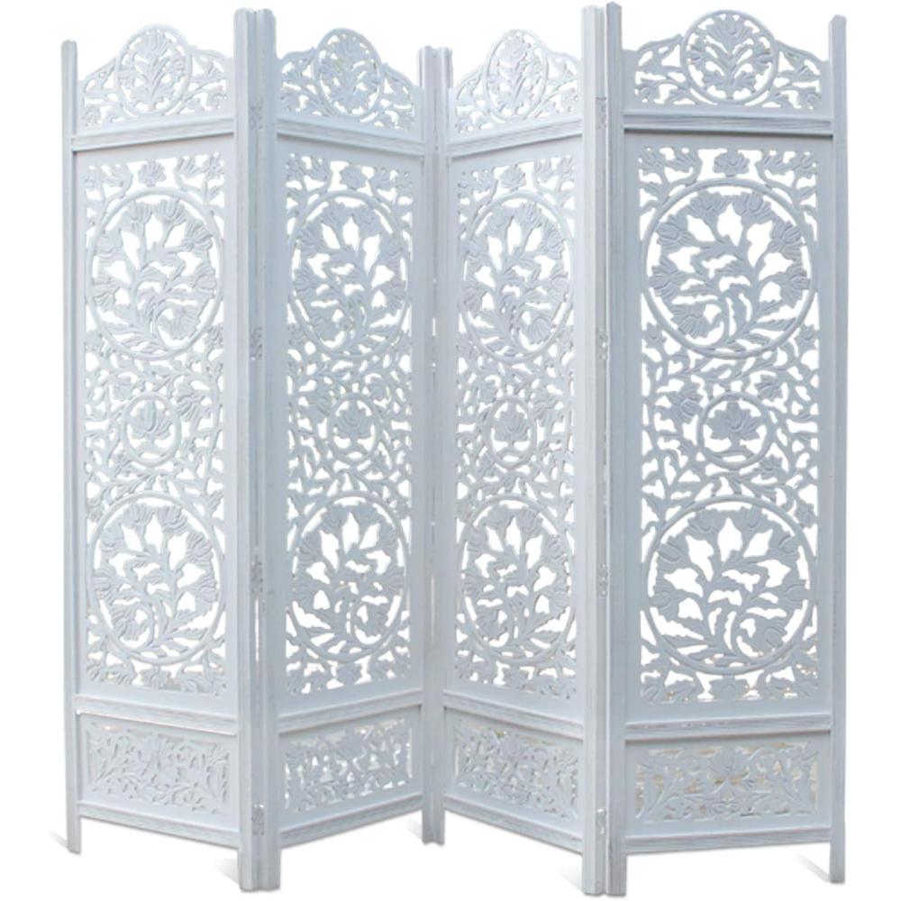 STYLE: Kamal – Antique White Handcrafted Wood Room Divider Screen. The screen has 4 panels and measures 72×80 Inch. All panels are .75 inches thick. The total weight is 50 pounds.. Kamal means lotus in Hindi and this design is in honor of the beautiful lotus flower. So if you are seeking a room of flowers, or a unique design, bring the Kamal into your life.