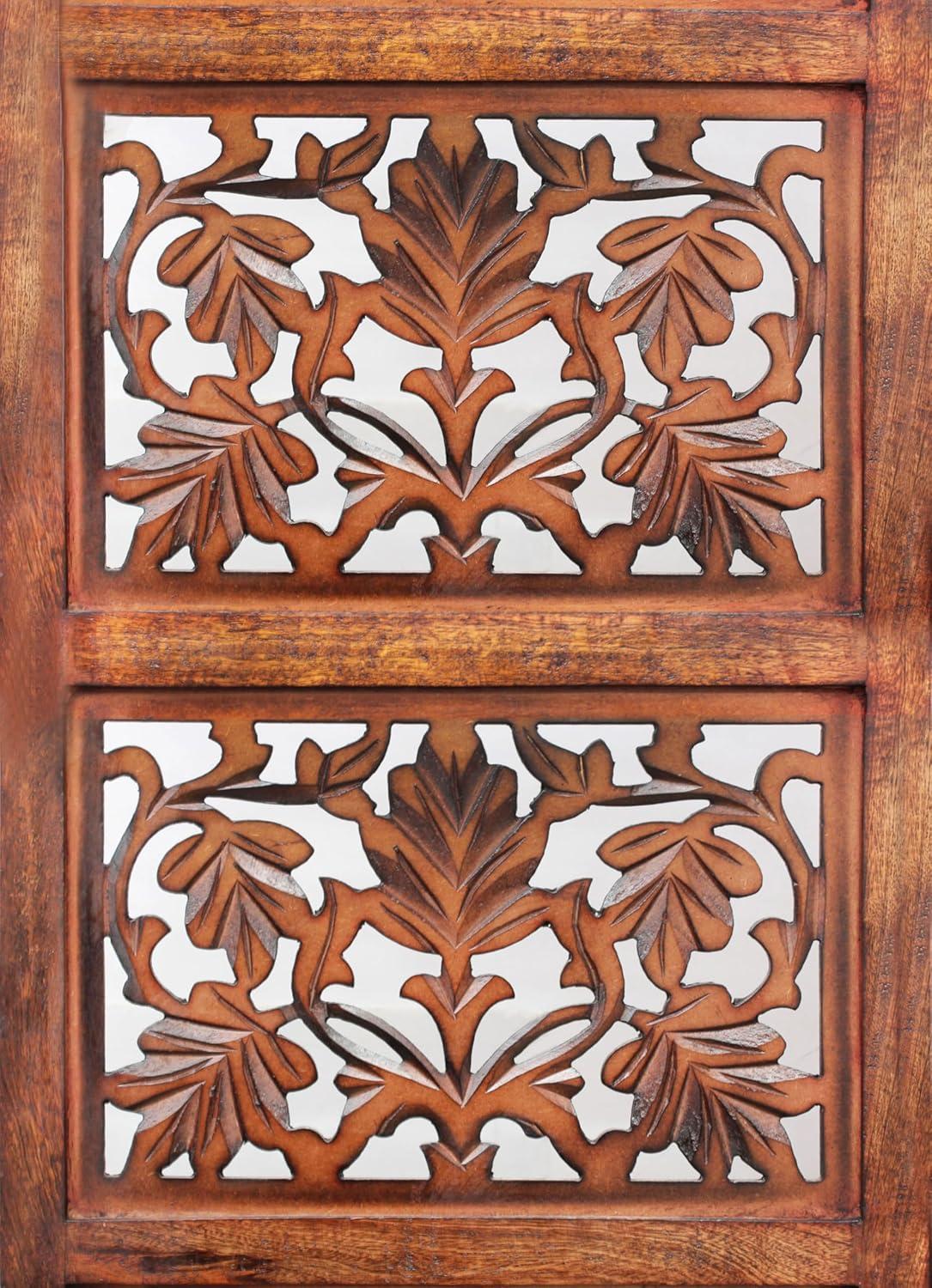 CONSTRUCTION and CARE: The Kamal floor screen frame is made of solid wood. The panels are hand carved on MDF on both sides, making it fully reversible. Twelve metal hinges keep the panels secure. Now with reinforced packaging for better shipping. Clean with a soft, dry cloth. Do not use heavy furniture sprays or waxes or any abrasive compound. Part of the beauty of the floor screen is it is simple to clean and maintain.