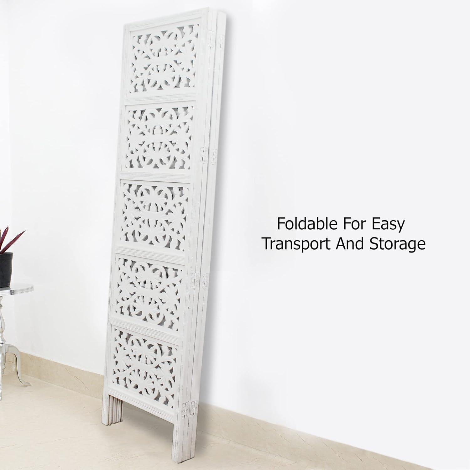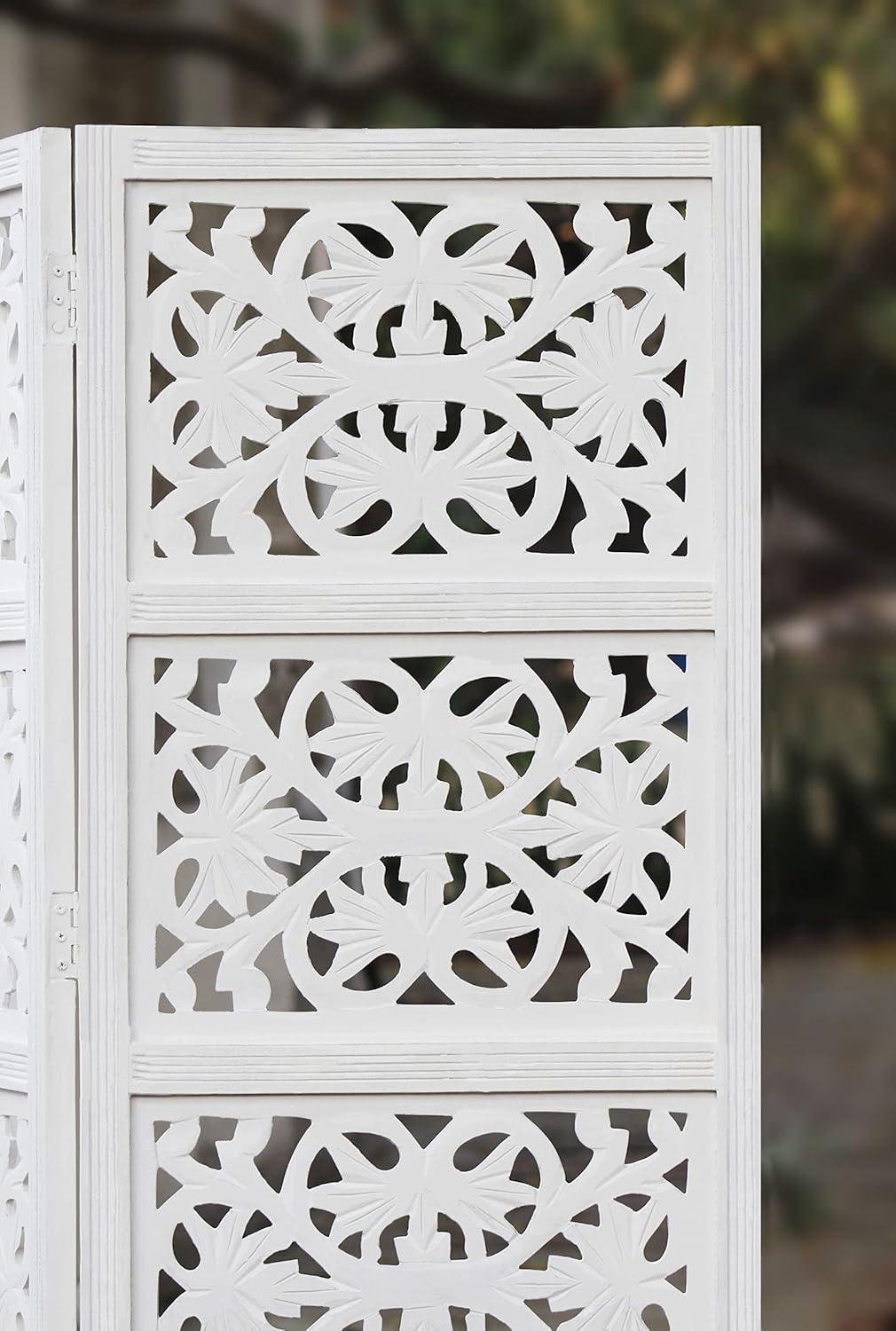 STYLE: Kamal – Antique White Handcrafted Wood Room Divider Screen. The screen has 4 panels and measures 72×80 Inch. All panels are .75 inches thick. The total weight is 50 pounds.. Kamal means lotus in Hindi and this design is in honor of the beautiful lotus flower. So if you are seeking a room of flowers, or a unique design, bring the Kamal into your life.