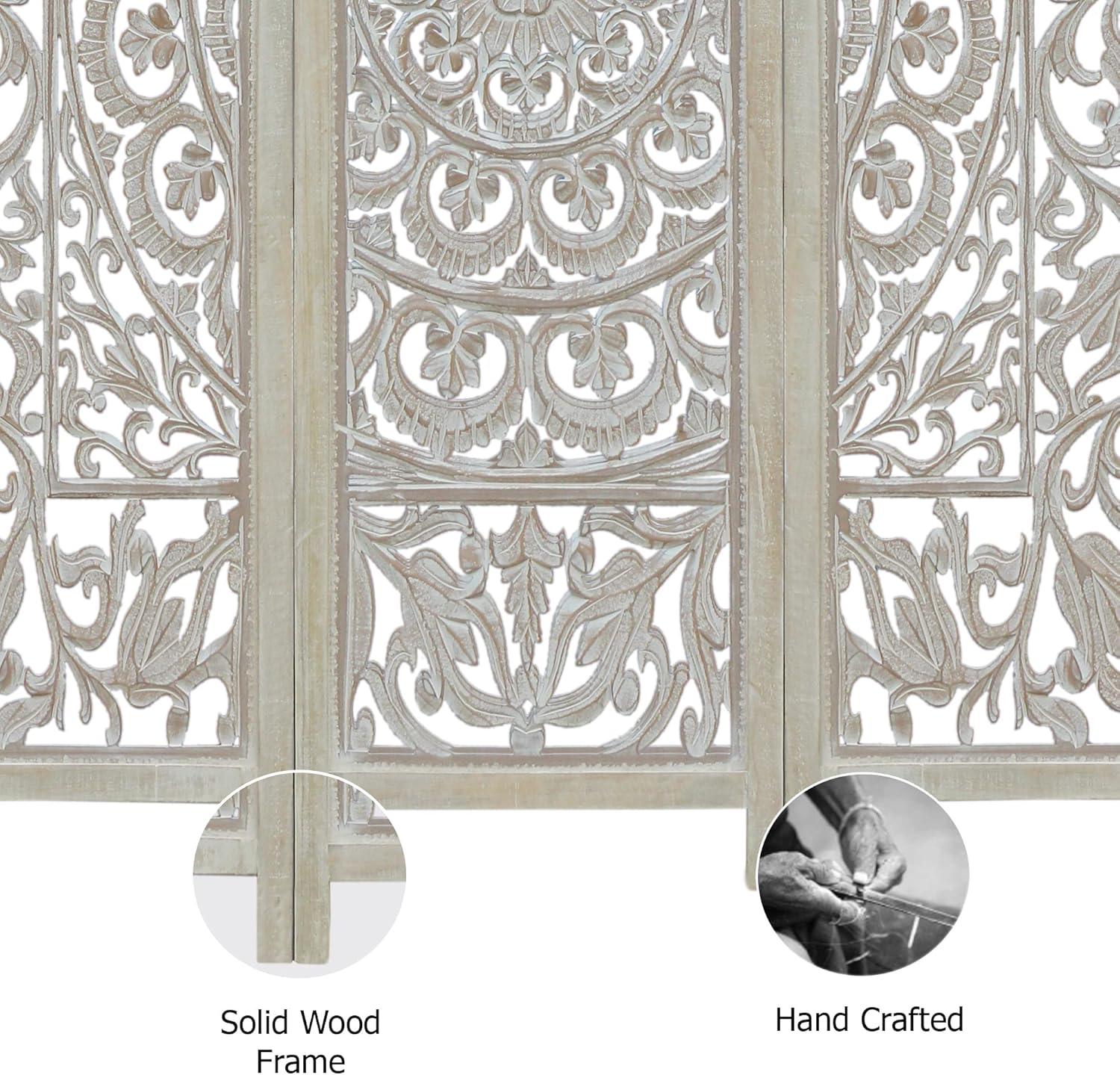 DECORATIVE: This traditional design using a lotus motif in an antique white finish. It will add sophistication, elegance and intrigue to any room. This intricately designed screen's panels are hand carved and then delicately finished. The antique white screen will enhance any room. Whether your decor is coastal, transitional, bohemian or farmhouse, let this beautiful screen stand alone against the wall or in the middle of the room as decor. Perfect for a sun room!