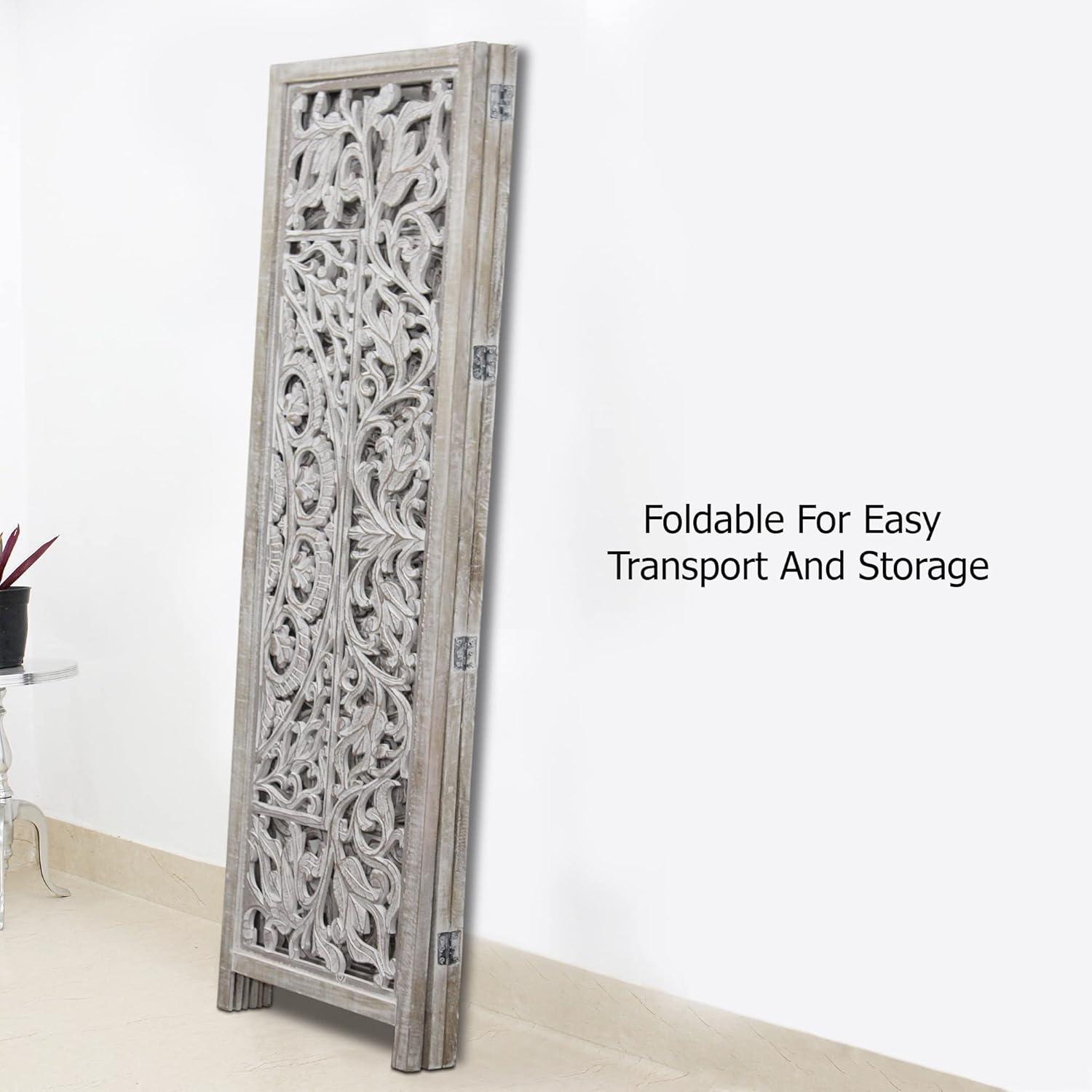 STYLE: Kamal – Antique White Handcrafted Wood Room Divider Screen. The screen has 4 panels and measures 72×80 Inch. All panels are .75 inches thick. The total weight is 50 pounds.. Kamal means lotus in Hindi and this design is in honor of the beautiful lotus flower. So if you are seeking a room of flowers, or a unique design, bring the Kamal into your life.