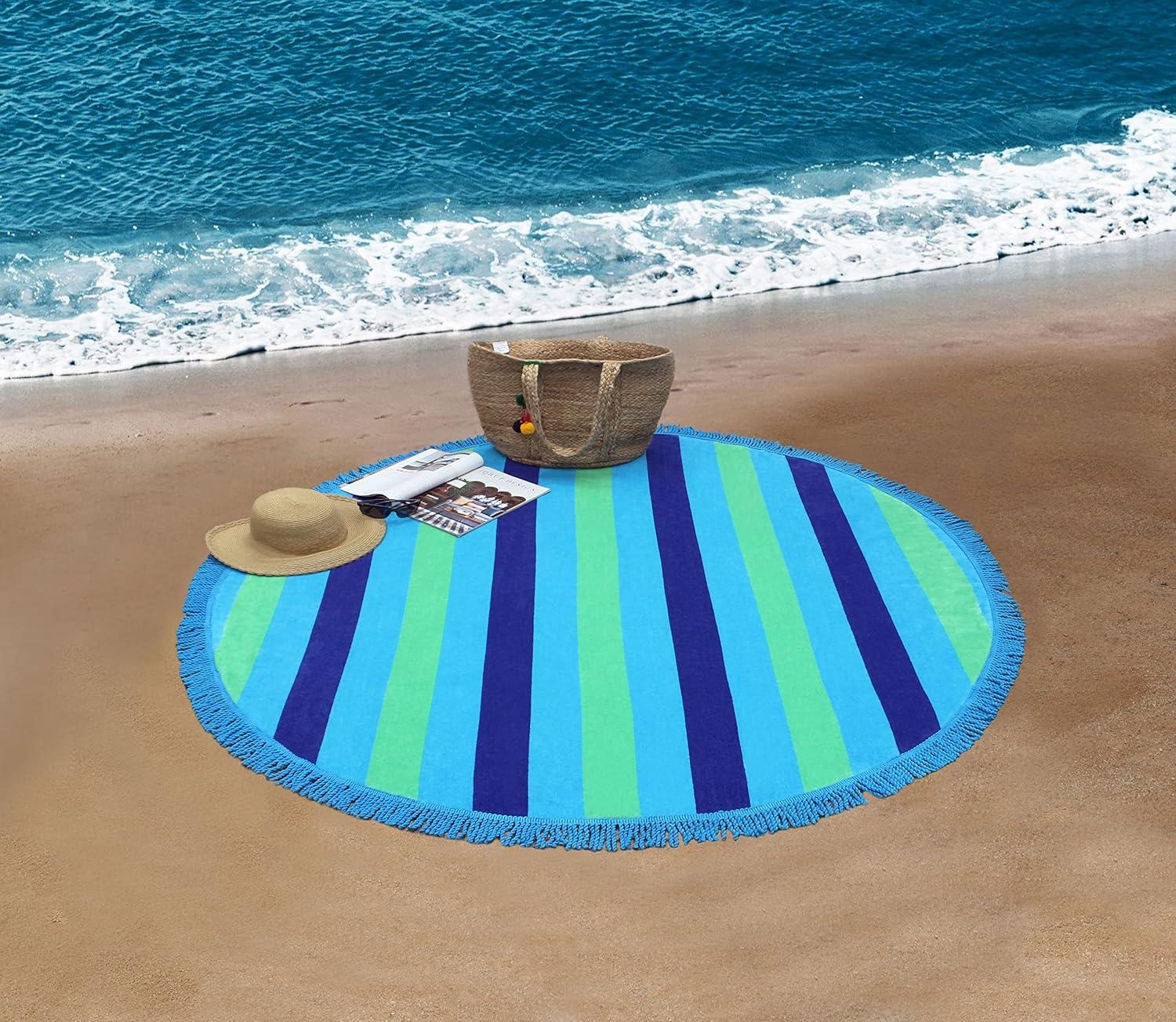 COTTON CRAFT Round Beach Towel Blanket – 100% Cotton Plush Jacquard Velour 5 Foot Pool Picnic Towel Yoga Meditation Mat – 60 Inch Circular Beach Blanket Throw with Fringe – Cabana Stripe Blue Green(Cabana Stripe Blue Green)