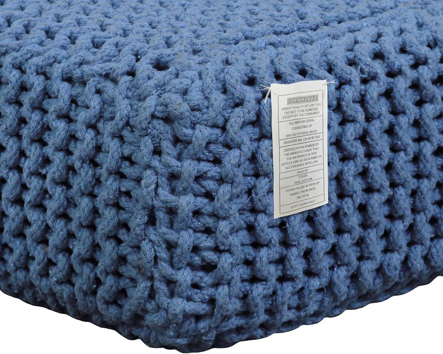 COTTON CRAFT Round Dori Pouf – Cotton Braid Cord Cable Knitted Ottoman – Foot Stool Footrest Floor Pouf Accent Furniture Bean Bag – Living Room Dorm Décor – 20.5 Dia x 13.5 High – Round Ivory Cream(Blue – Cube Small)