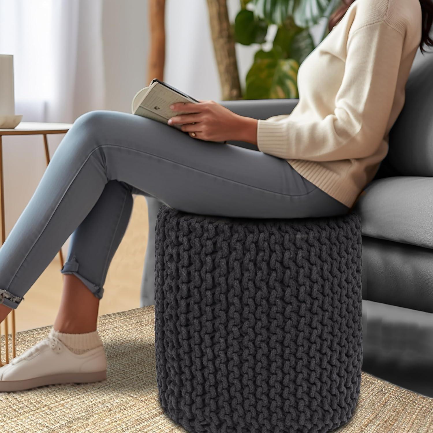 COTTON CRAFT Round Dori Pouf – Cotton Braid Cord Cable Knitted Ottoman – Foot Stool Footrest Floor Pouf Accent Furniture Bean Bag – Living Room Dorm Décor – 20.5 Dia x 13.5 High – Round Ivory Cream(Grey – Cylindrical)
