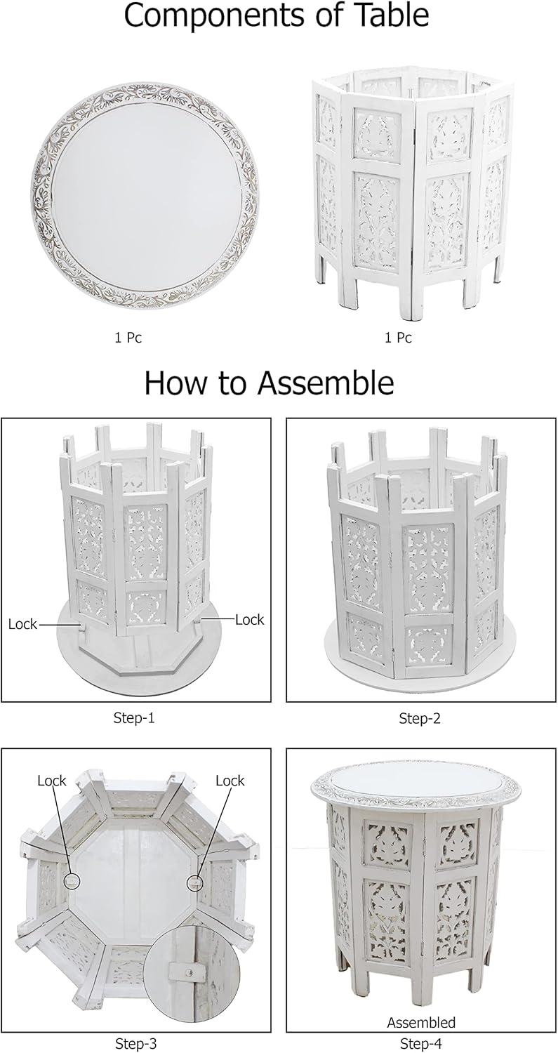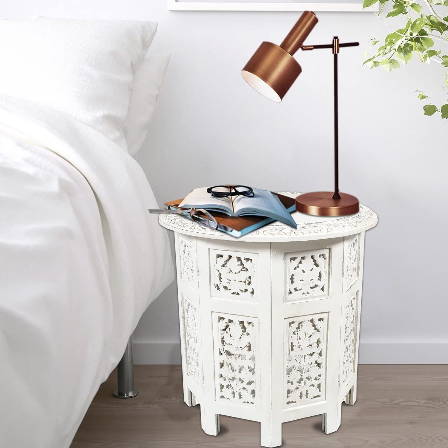 Cotton Craft Solid Wood Accent End Table – Hand Carved Vintage Boho Folding Side Table – Small Spaces Entryway Farmhouse Living Room Bedside – No Tools Assembly -18×18 Round – Jaipur Antique Brown(Antique White)