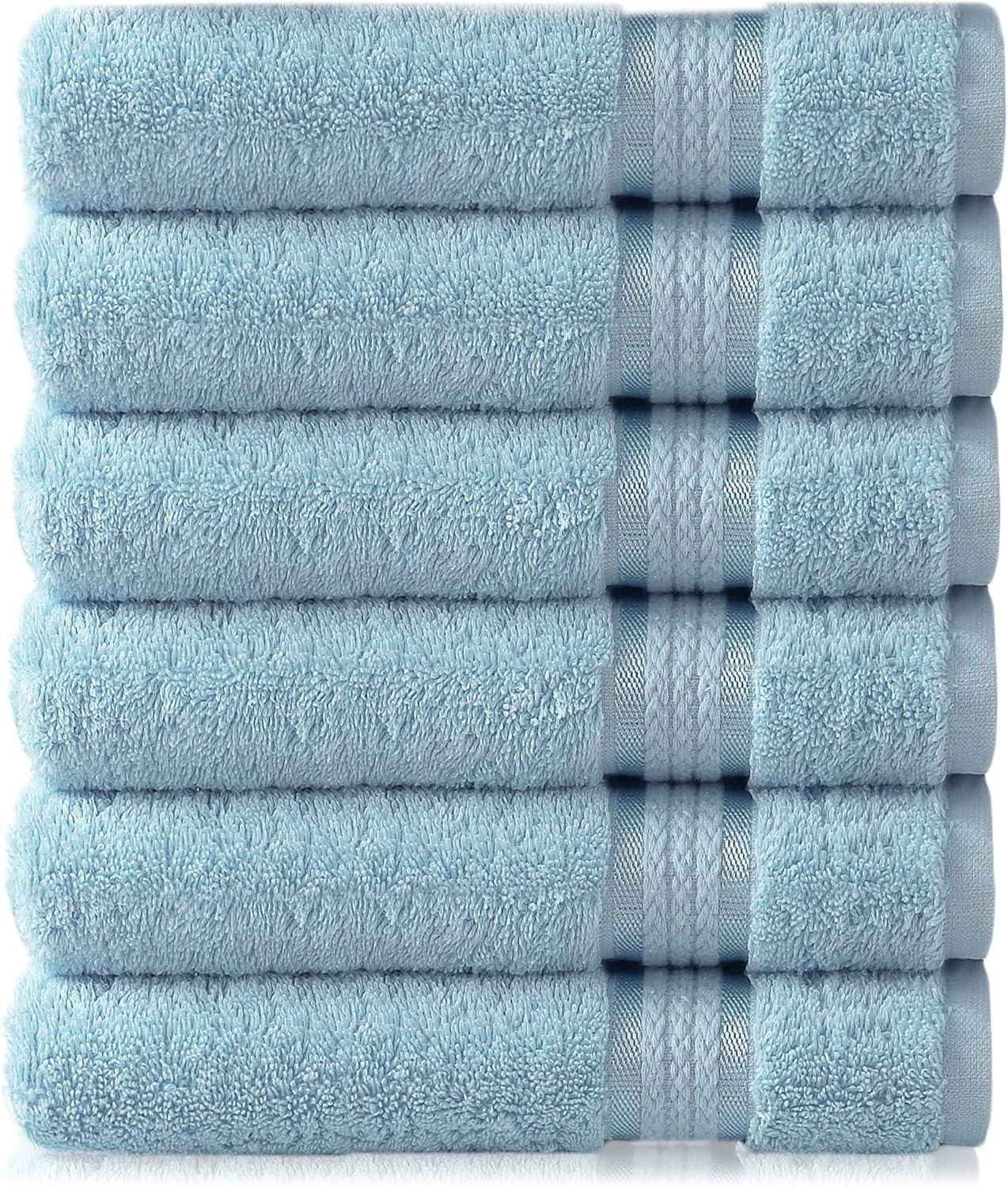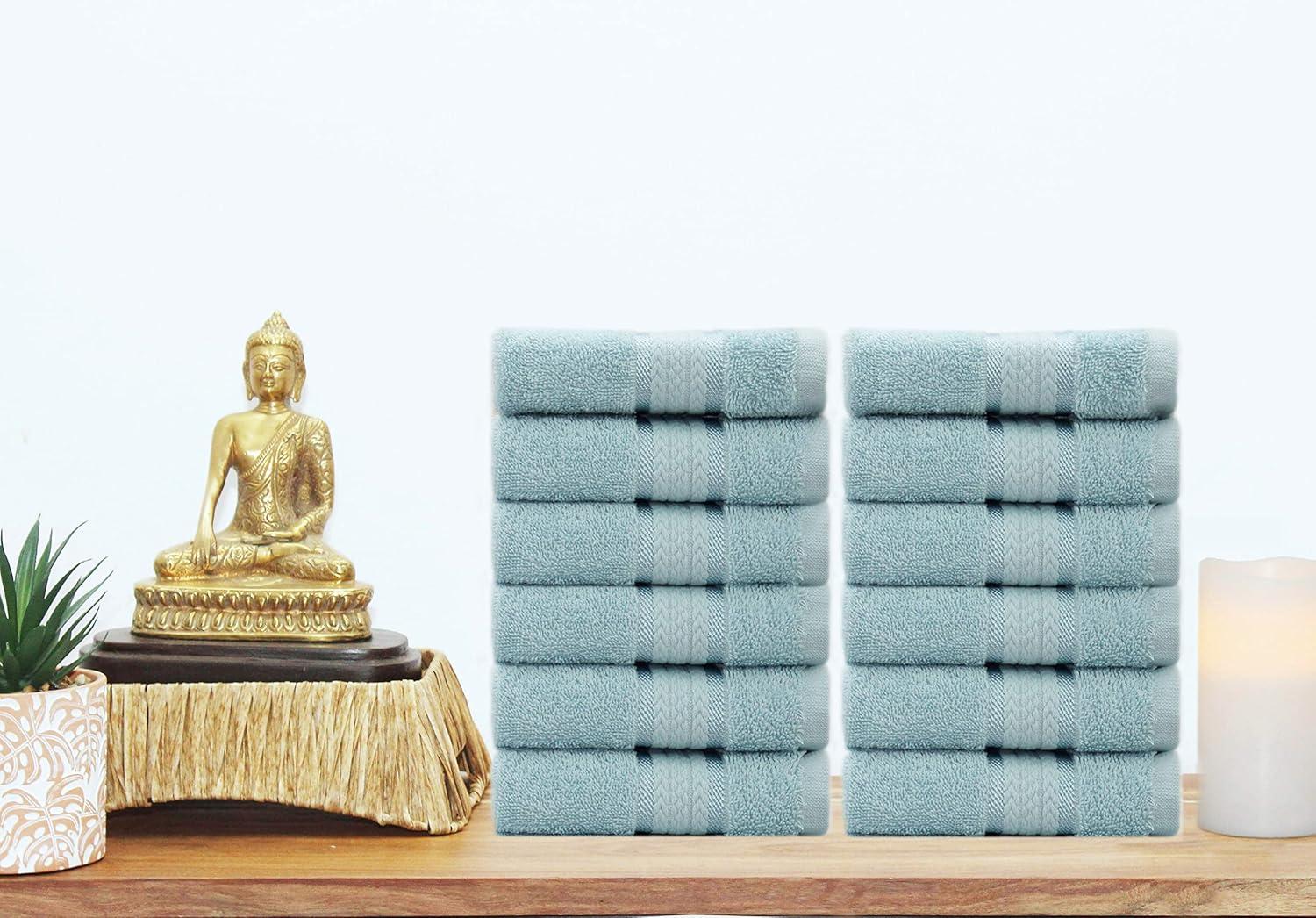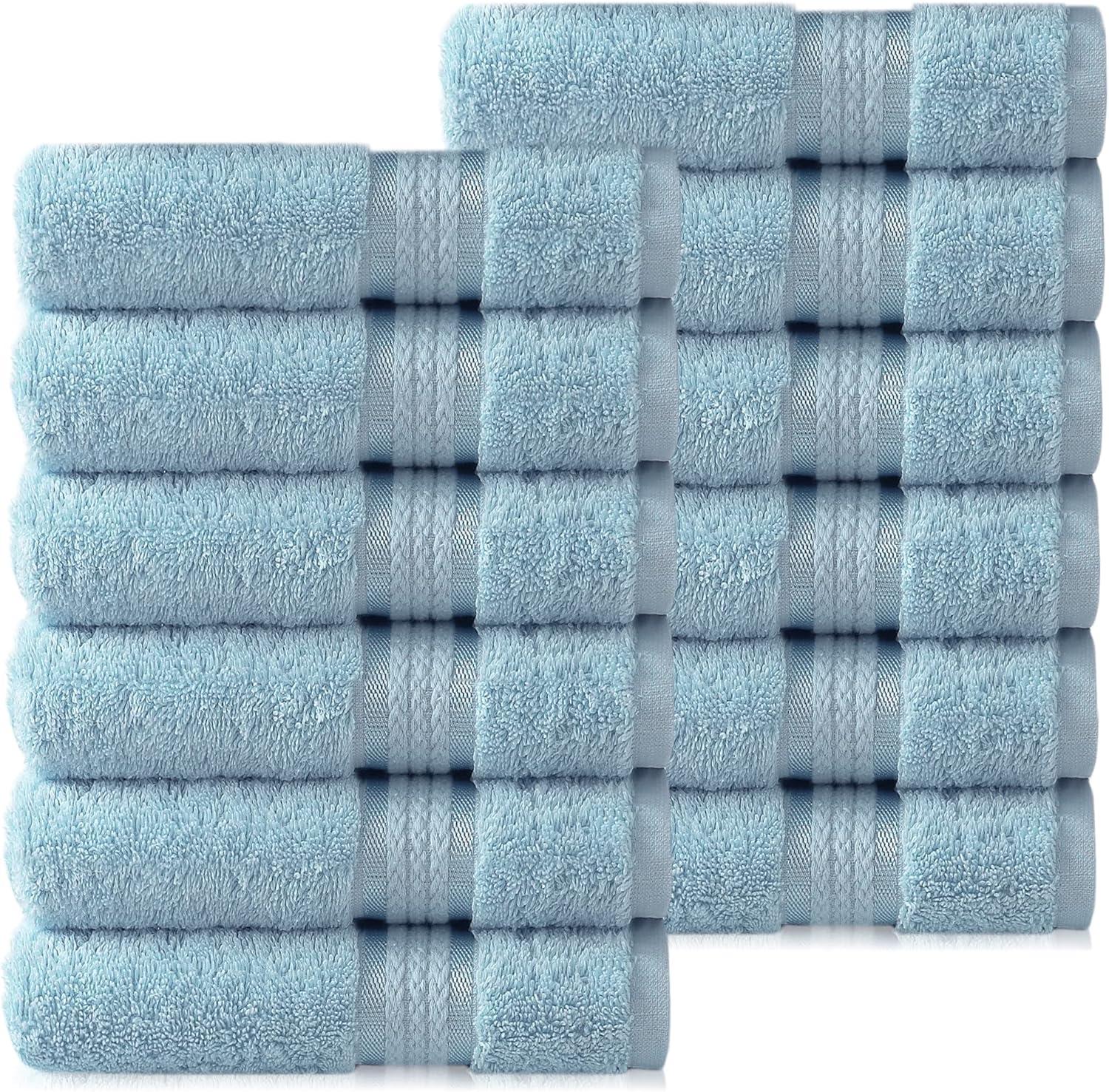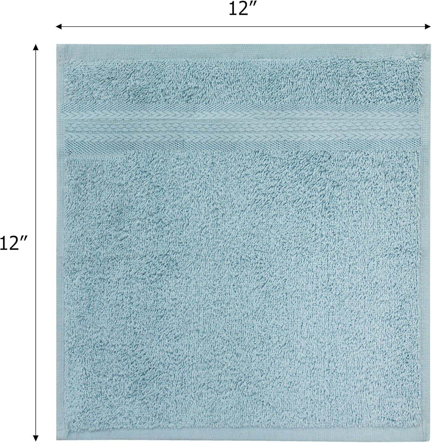 SET INCLUDES: Twelve 12 x 12 inches COTTON CRAFT Ultra Soft Luxury Wash Cloths in Light Blue. Plush, Absorbent 580 GSM weight.