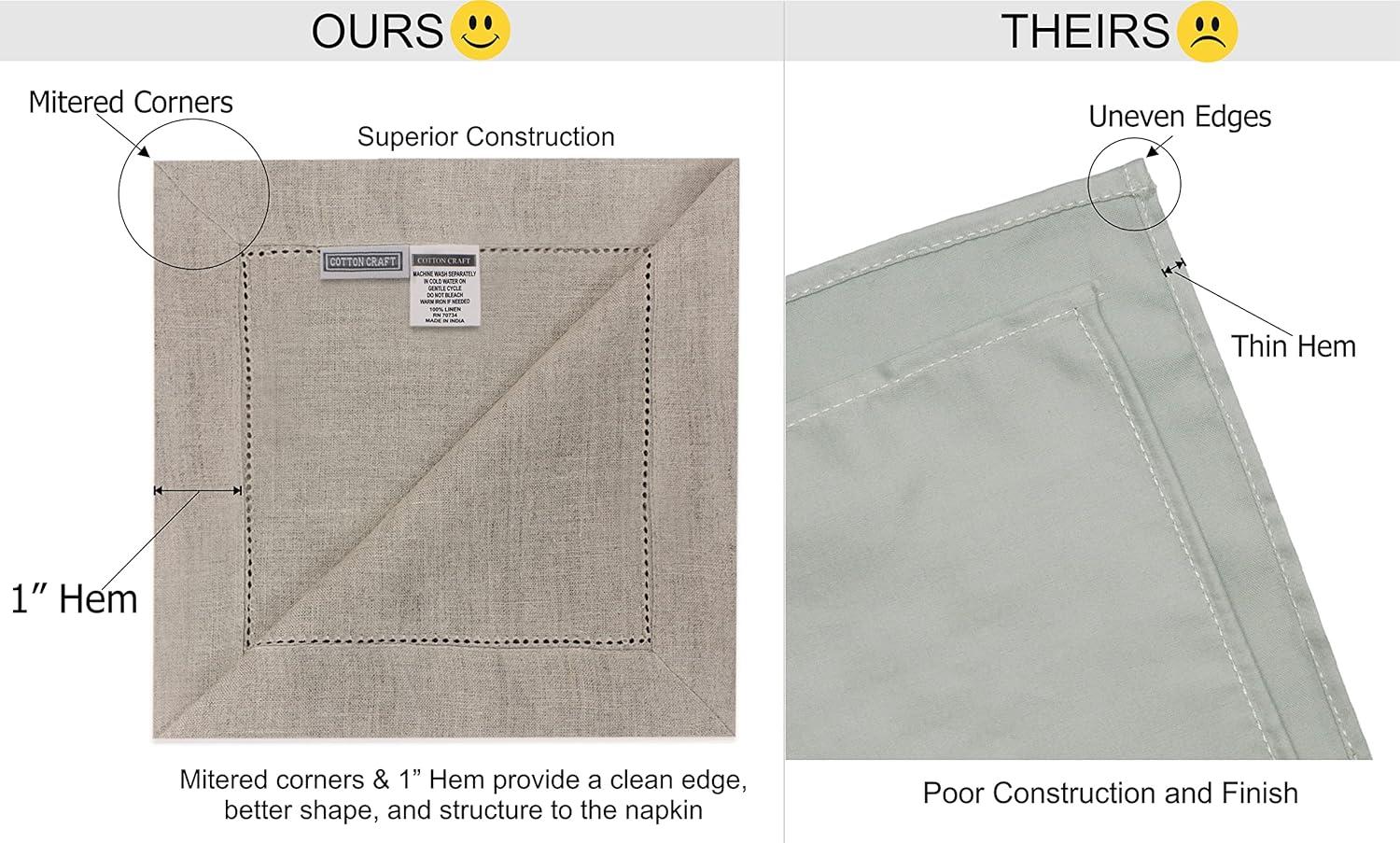 SET CONTENTS: Set includes twelve (12) COTTON CRAFT Pure Linen Dinner Napkins in Natural with Elegant Hemstitch Detail, each measuring 18 inches x 18 inches. Our linen napkins are made from 100% light and airy linen unlike others that sell cotton blended linen napkins.