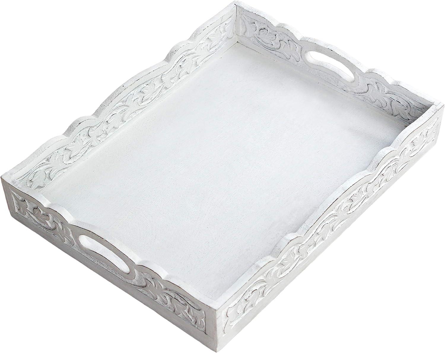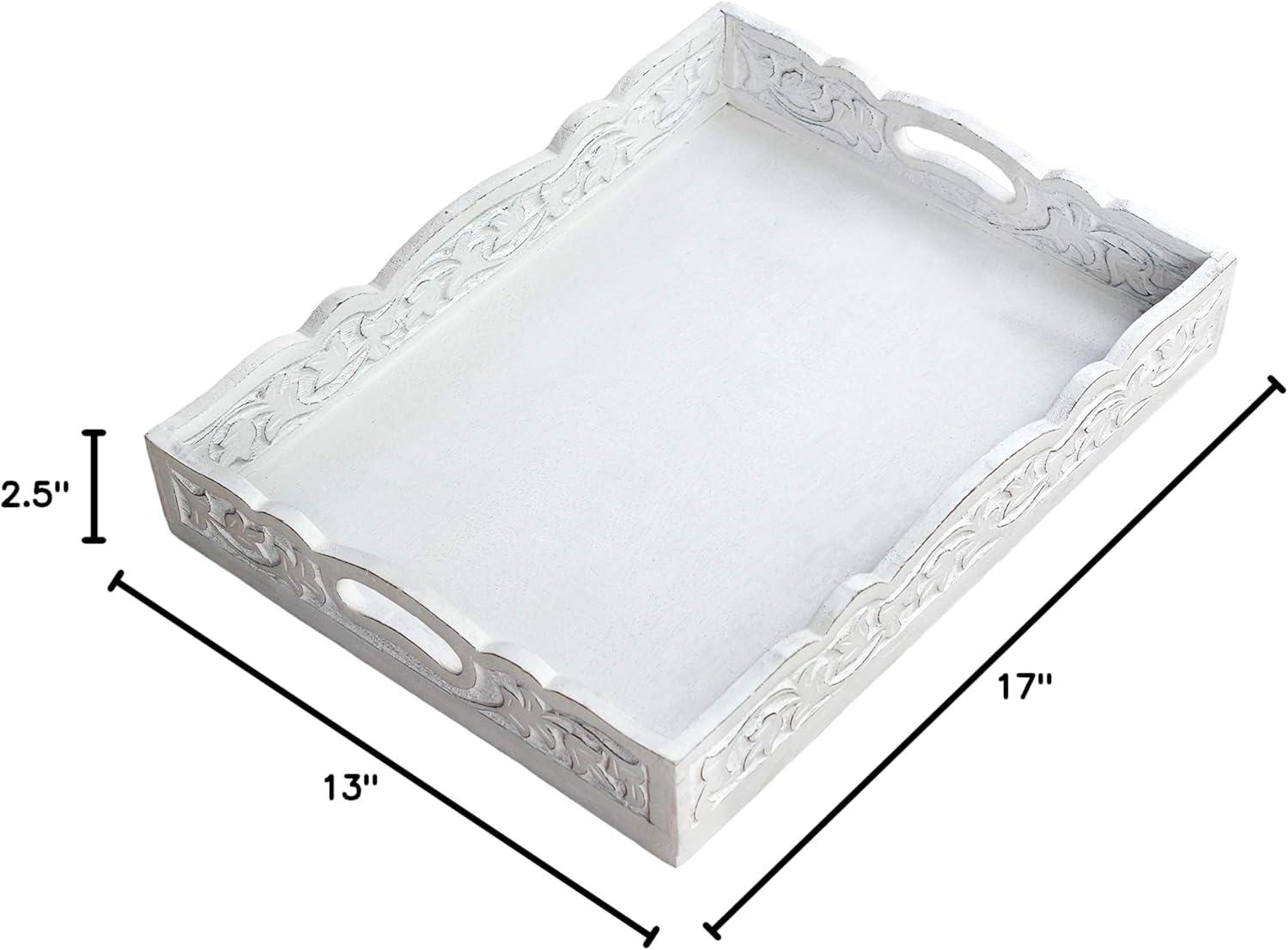 Hand Carved Wooden Serving Tray – Decorative Breakfast Tray with Handles – Rustic Wooden Food Tray with Intricate Detail – Unique Furnishing Accent – Distressed White Finish – 17x13x2.5 – COTTON CRAFT