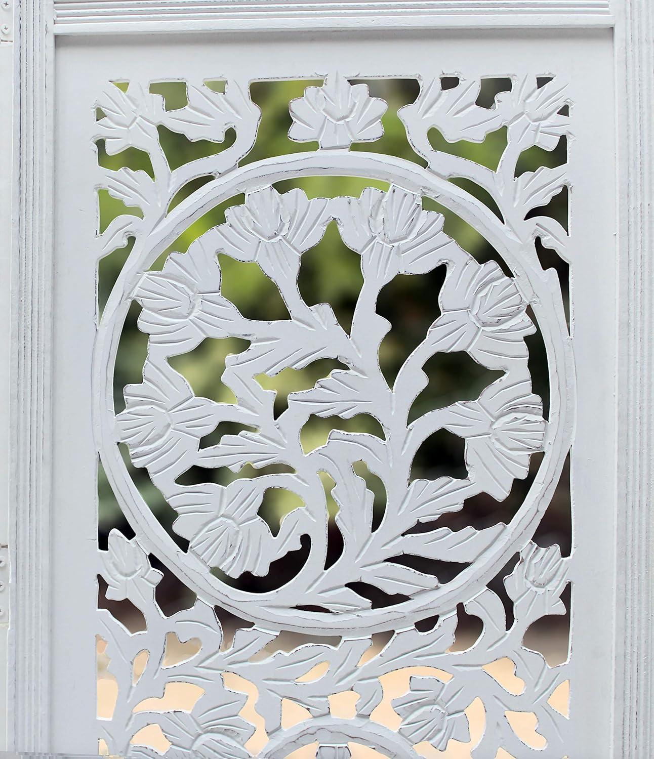 Room Divider Wood Floor Screen Partition – Sari Patchwork Fabric on Antique Brown Wood Frame – Three Folding Panels 60×72 – Free Standing Portable Small Spaces Boho Hand Crafted Screen – COTTON CRAFT(Kamal – Antique White)