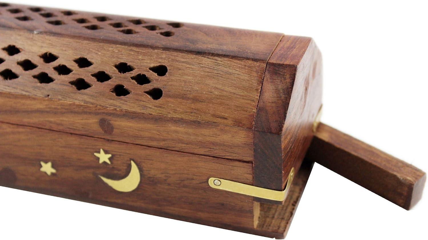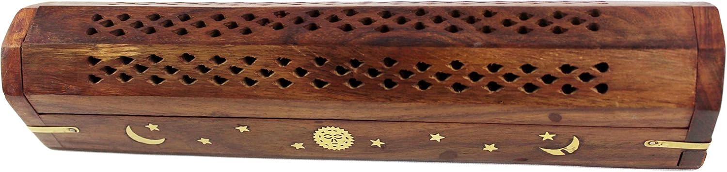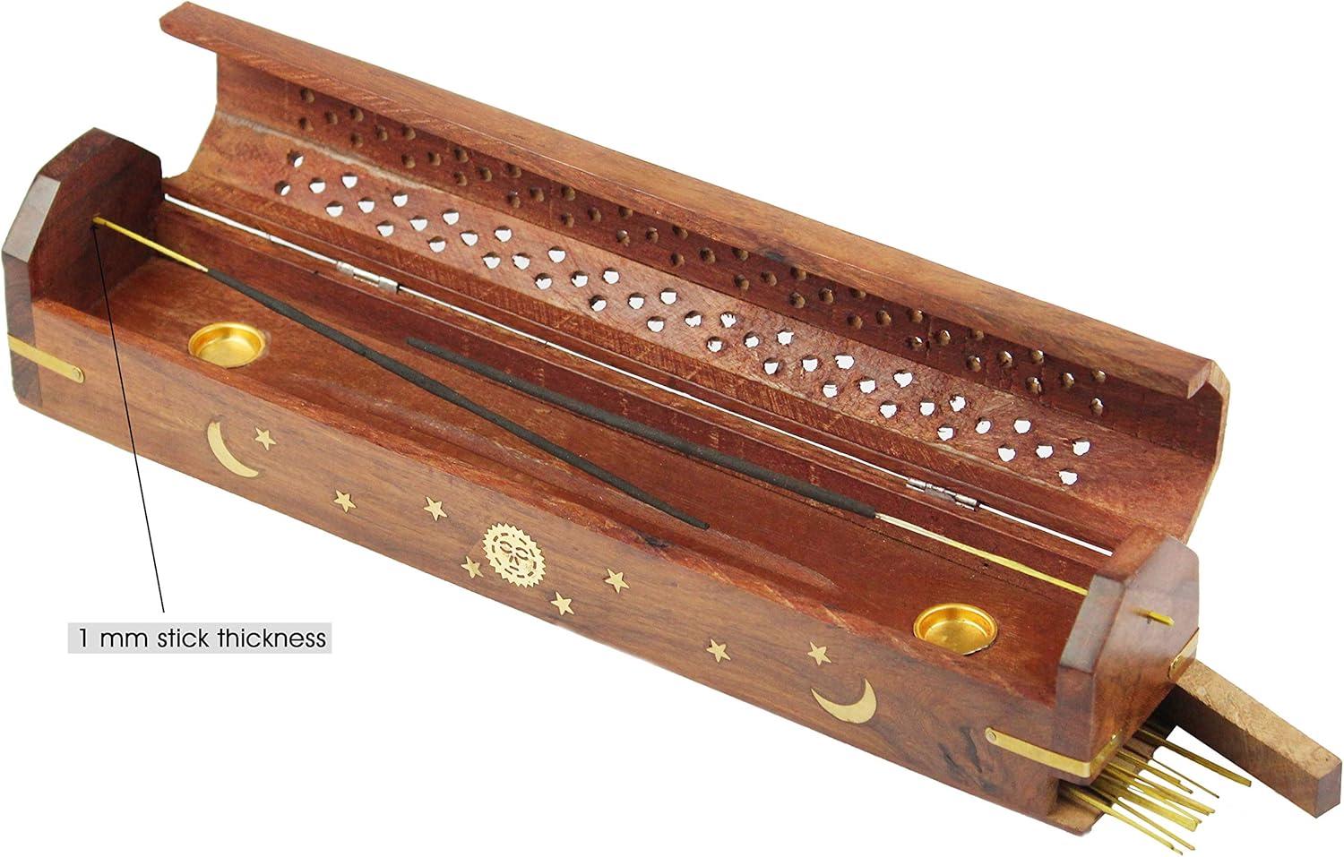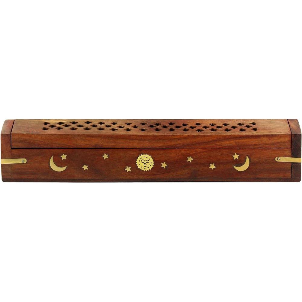 CONSTRUCTION: Beautifully handcrafted from Sheesham Wood with Sun and Moon Brass inlay decoration and a hidden storage compartment for incense sticks.